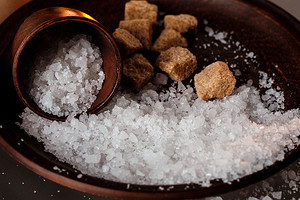 - Не убирая соль, засыпать ее сахаром и оставить так на несколько минут. После собрать и выбросить в мусорку (не в раковину).