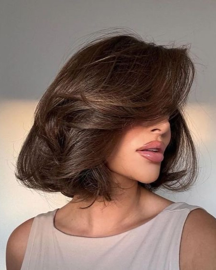 Воздушный боб — это про максимальный объем при минимальной длине. Стрижка работает на уровне чуть ниже подбородка и визуально «надувает» волосы изнутри. Именно поэтому ее обожают те, у кого от природы мало волос: правильная укладка с круглой щеткой или диффузором — и ты выглядишь так, будто волос втрое больше.