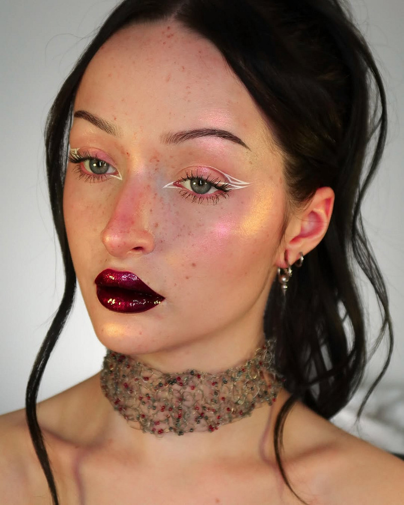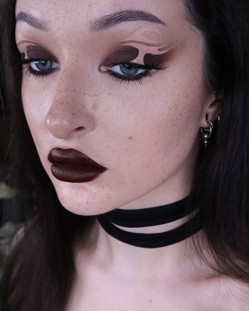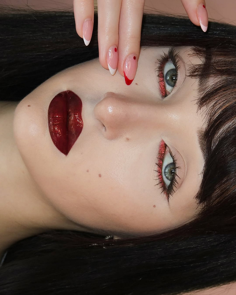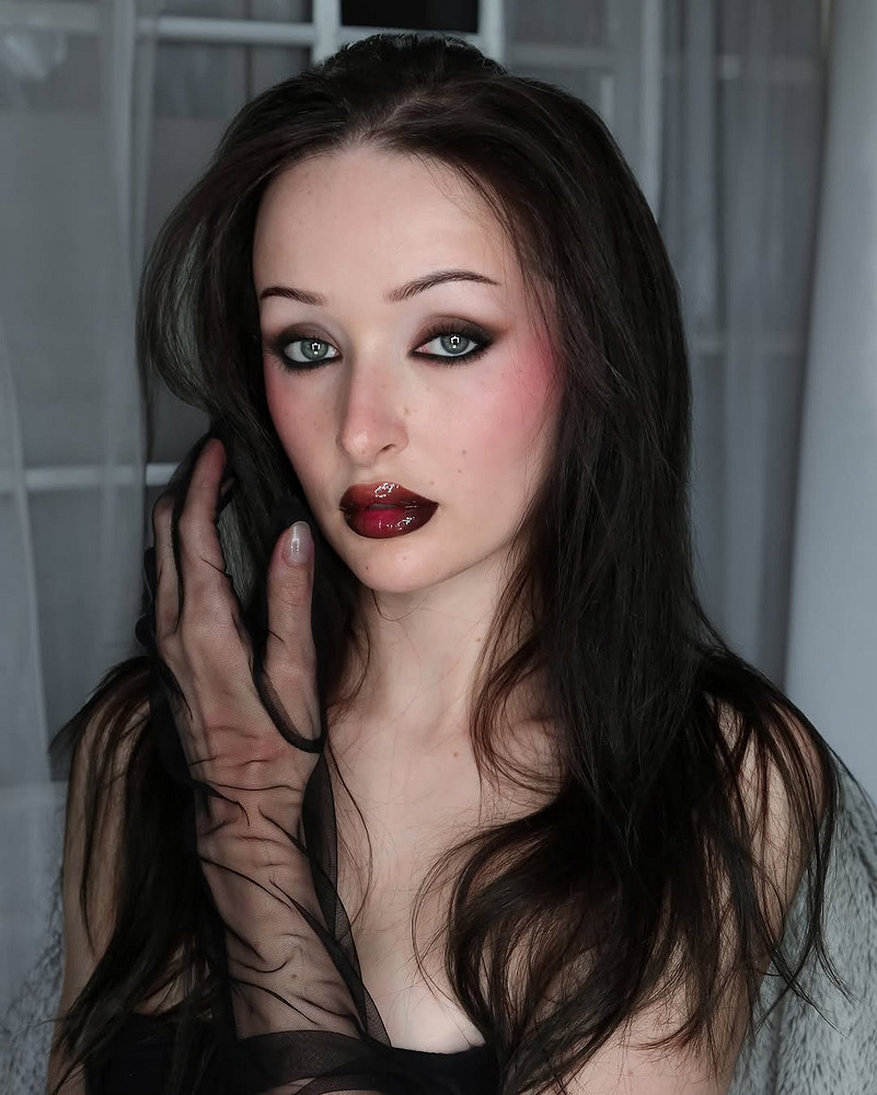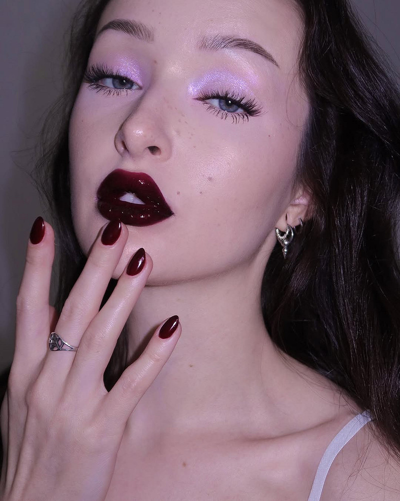 В 2026-м в макияж возвращается готическая эстетика, но не в классическом черно-фиолетовом варианте, а в более изысканном прочтении. Глубокий вишневый, почти черный сливовый, винный бордо, терракотово-коричневый с холодным подтоном — эти оттенки создают ощущение дорогой драмы, вампирского шика без пошлости.