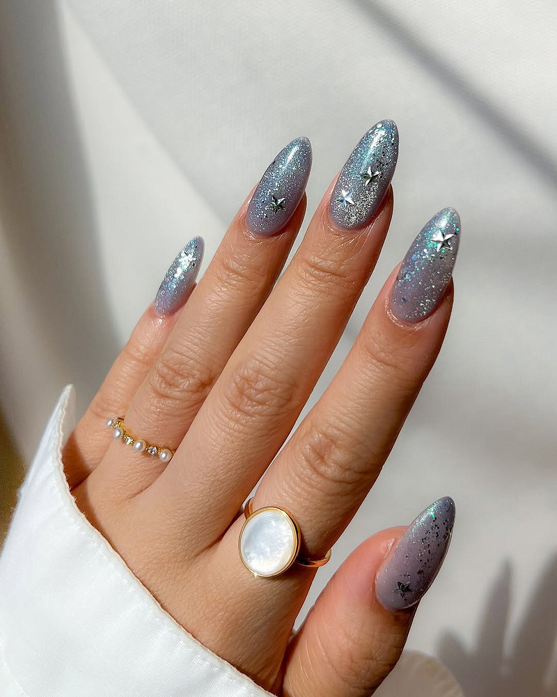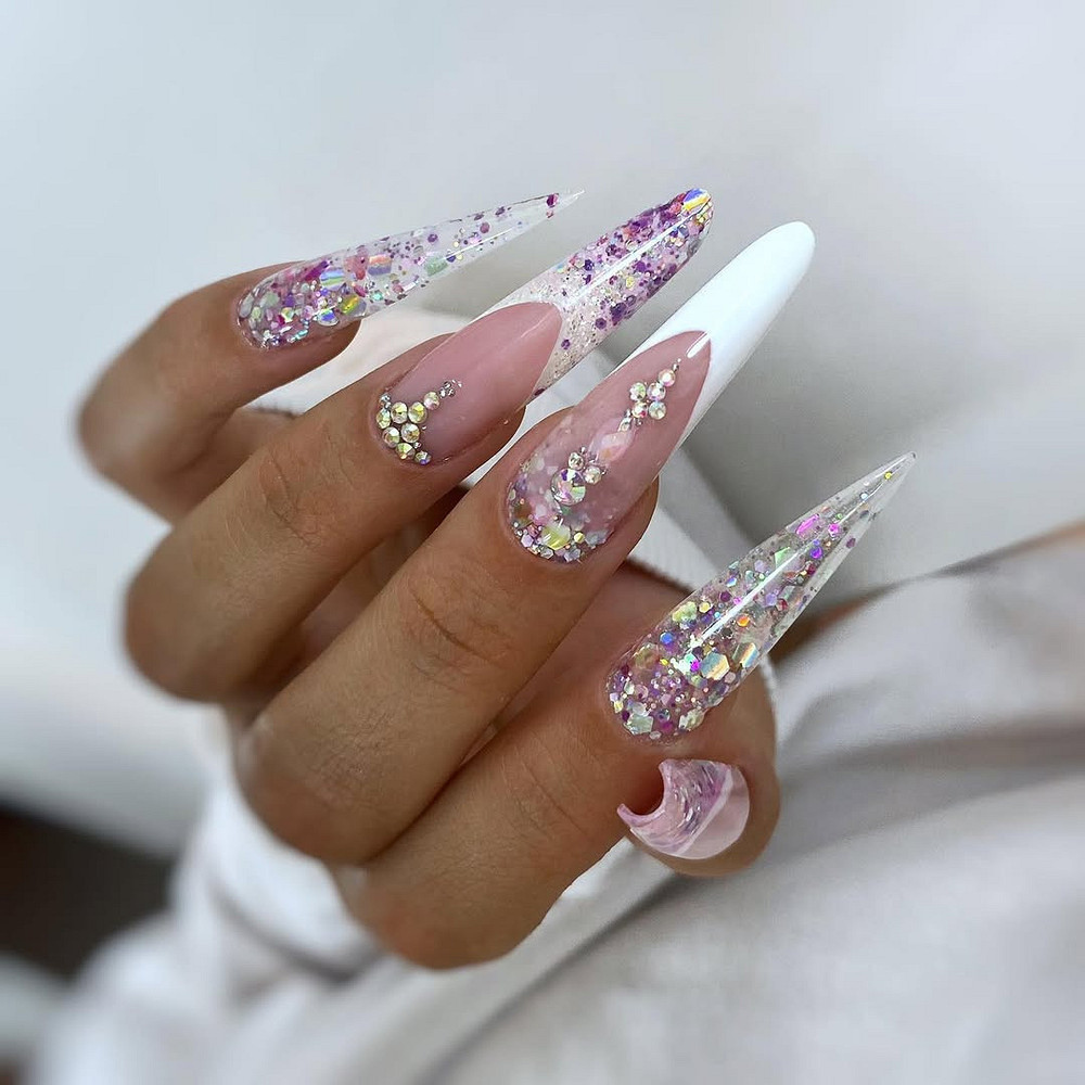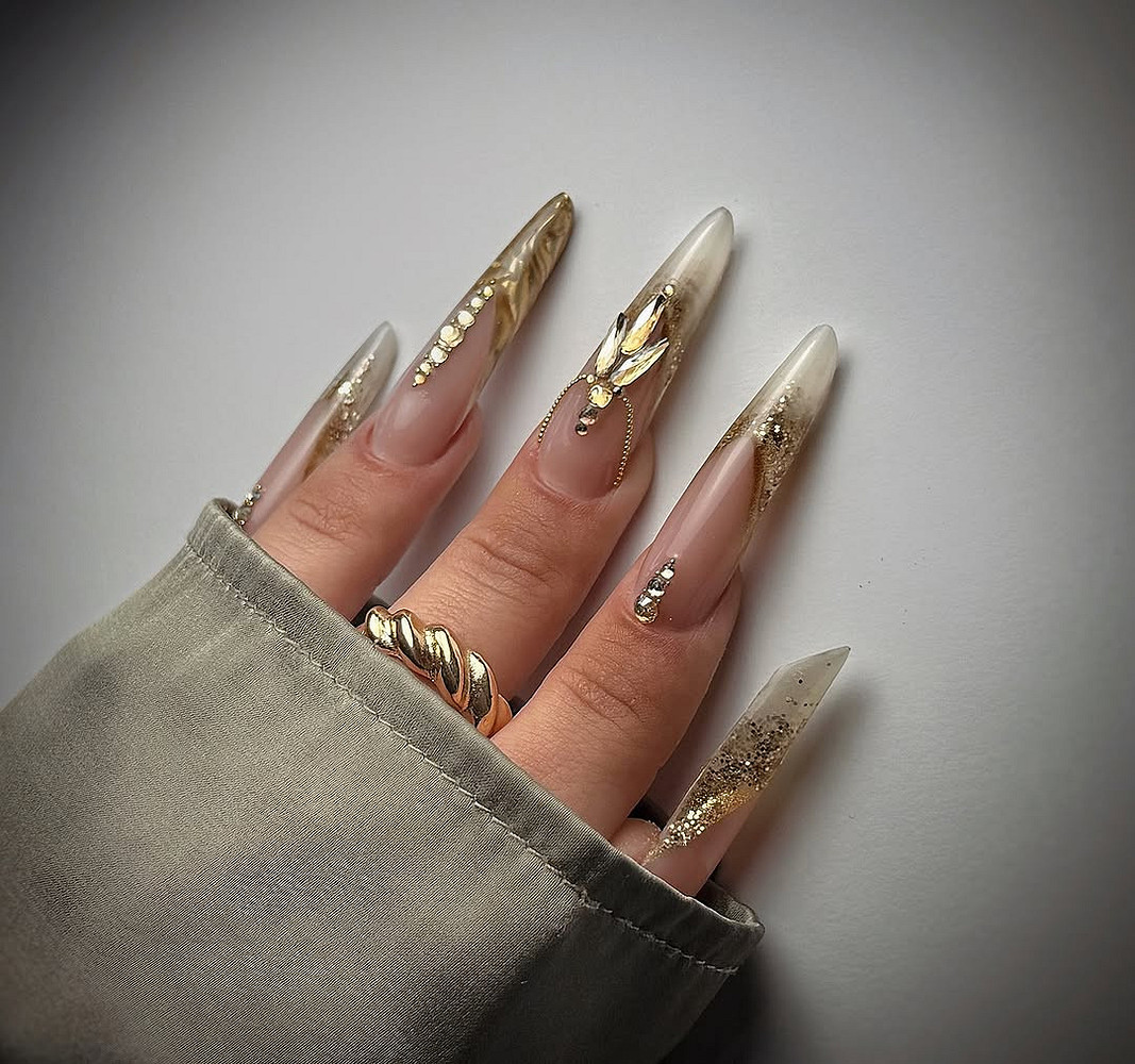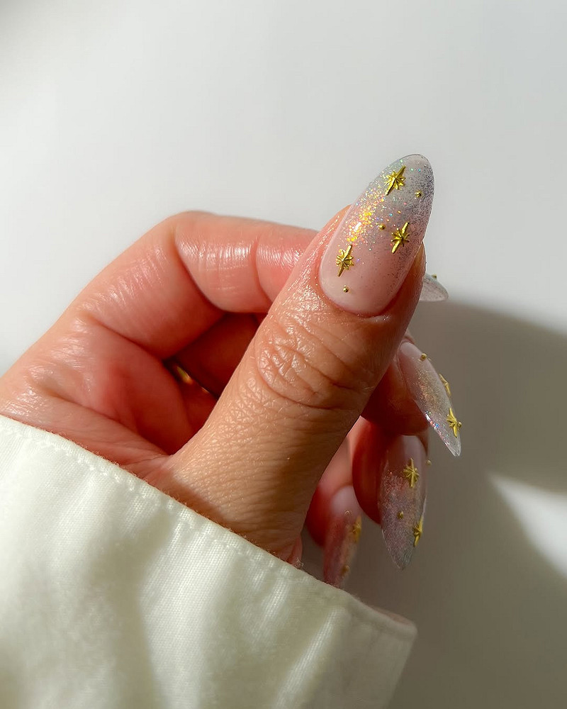 Не бойся миксовать текстуры. Например, сделай три ногтя матовыми, а два — в густом глиттере. Или попробуй градиент от прозрачной базы к взрыву блесток на кончике ногтя. Стразы и разнообразные украшательства, будь то камни, металлические элементы или конструкции посложнее, тоже никто не отменял. С ними твой маникюр автоматически переходит в категорию «вау».