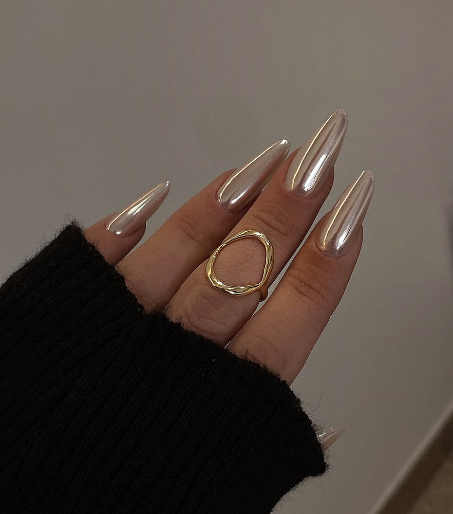 Также в тренды к декабрю уверенно выходит желтый с металлическим финишем. Это когда покрытие выглядит так, будто ногти сделаны из полированного золота — очень футуристично и дорого. И да, желтый отлично сочетается с красным и коричневым, так что можешь смело миксовать цвета на разных пальцах. Твоя задача — сиять, а не прятаться.