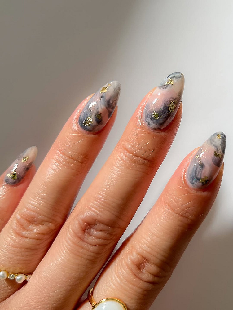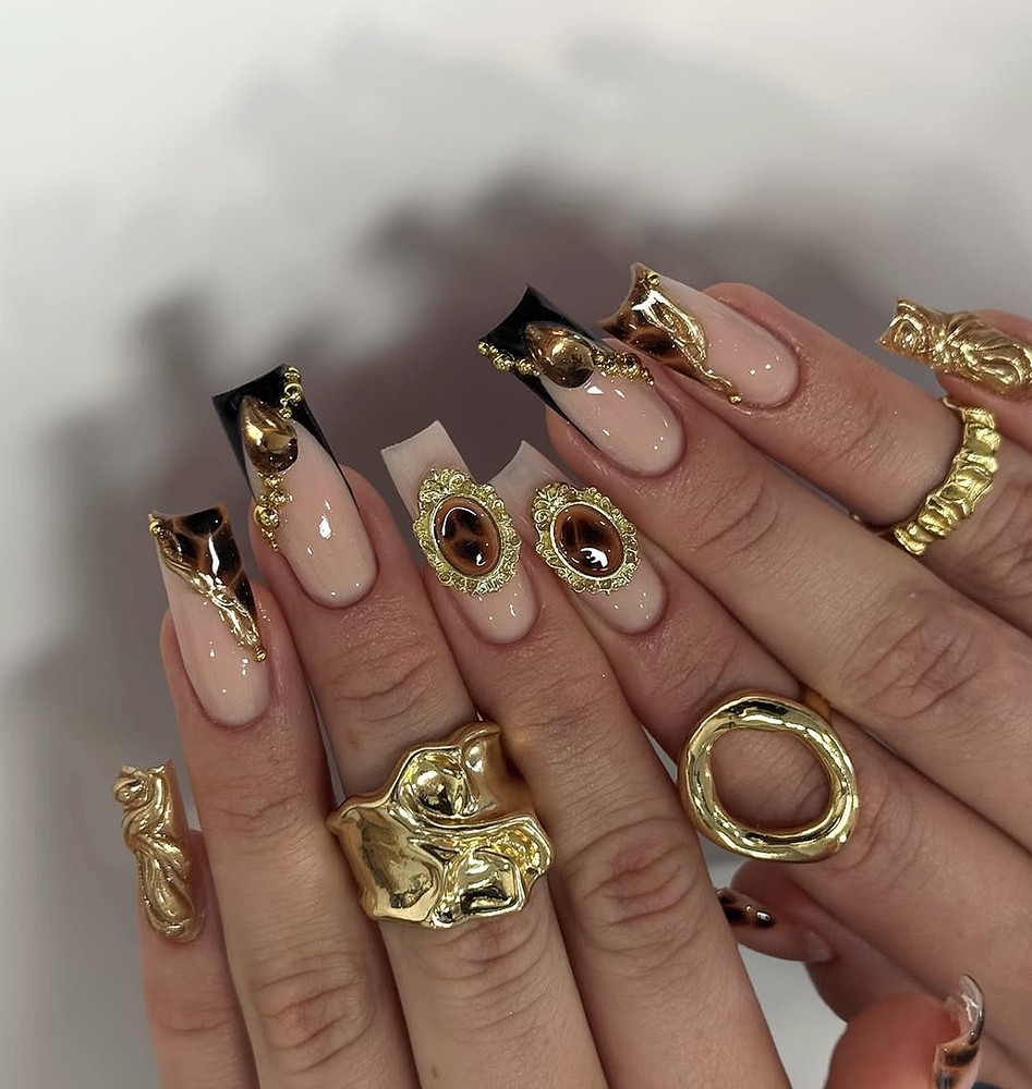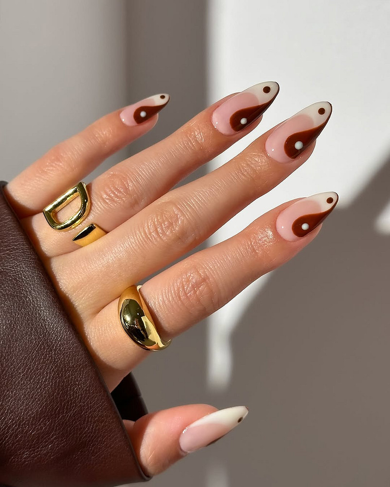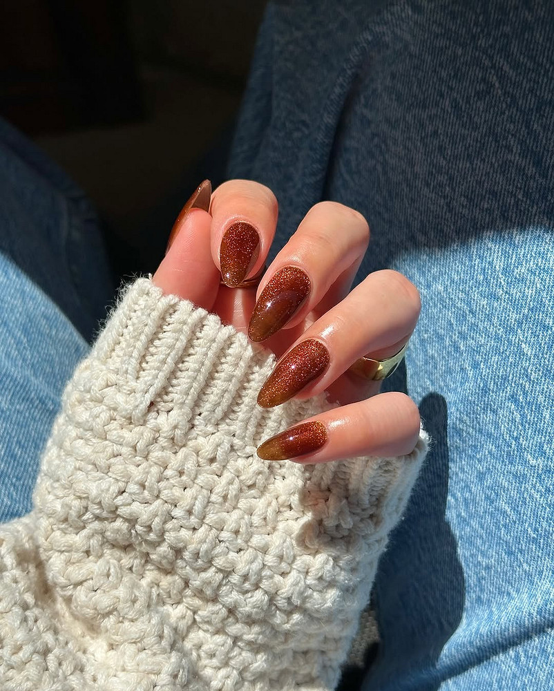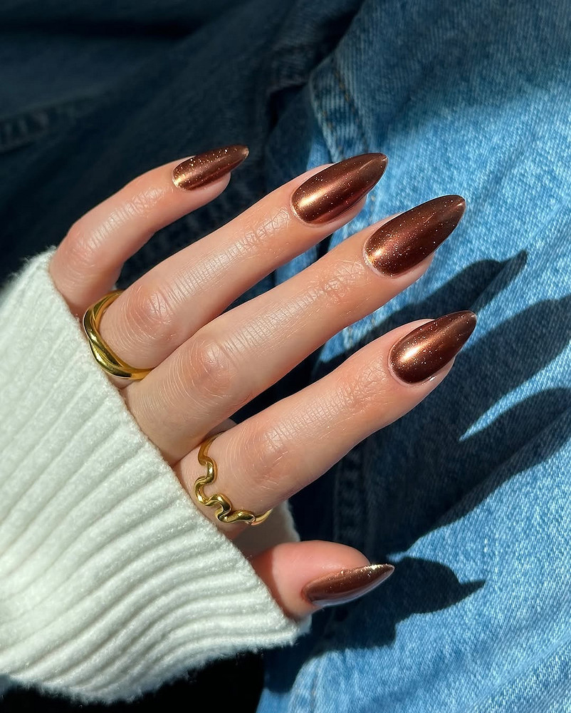 Уход в более светлые варианты вроде кофе с молоком — про элегантность без скуки. Карамельные, ореховые, тауповые оттенки невероятно комплементарны и работают как идеальная база для декора. Добавь золотой шиммер, тонкую полоску блеска или пару страз, чтобы получить маникюр, который выглядит одновременно сдержанно и празднично.