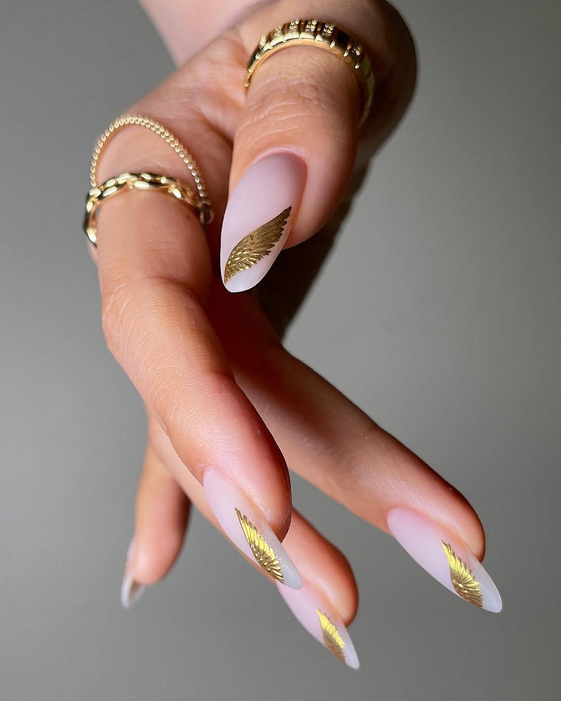 Золотой гель-лак — праздник на кончиках ногтей, который работает безотказно. Попробуй поиграть с оттенками: теплое медовое золото для смуглой кожи, холодное лимонное для светлой. Можешь сделать солнечный градиент от бледно-желтого к насыщенному золотому или добавить белые облачные разводы для эффекта утреннего неба.