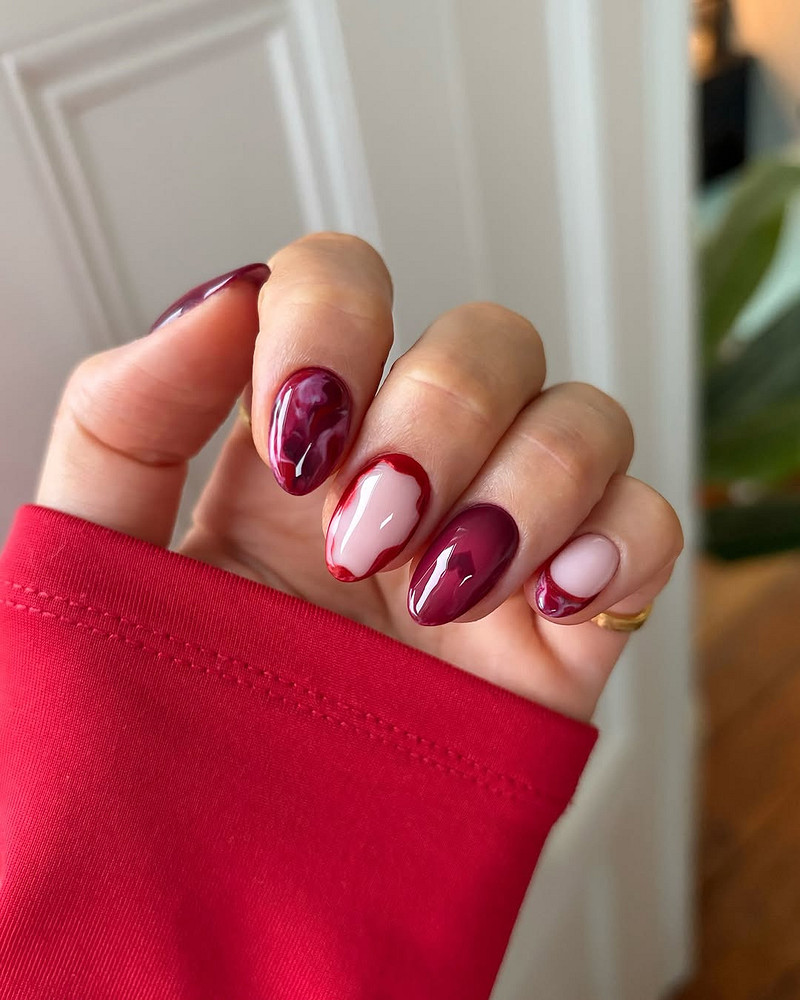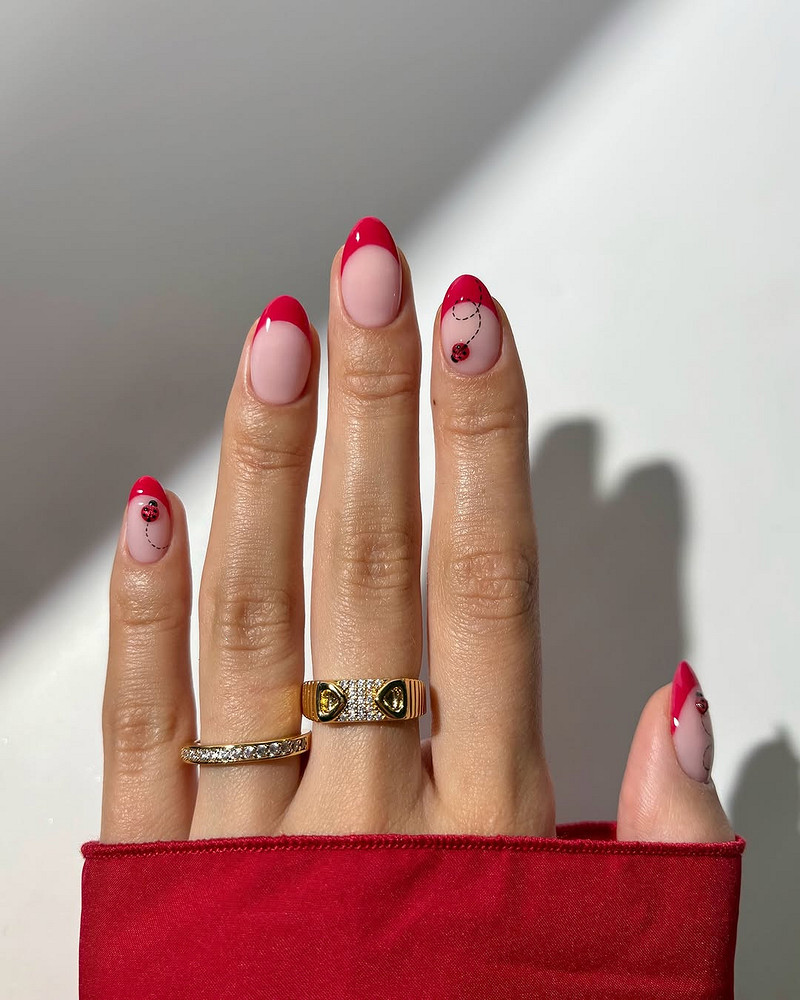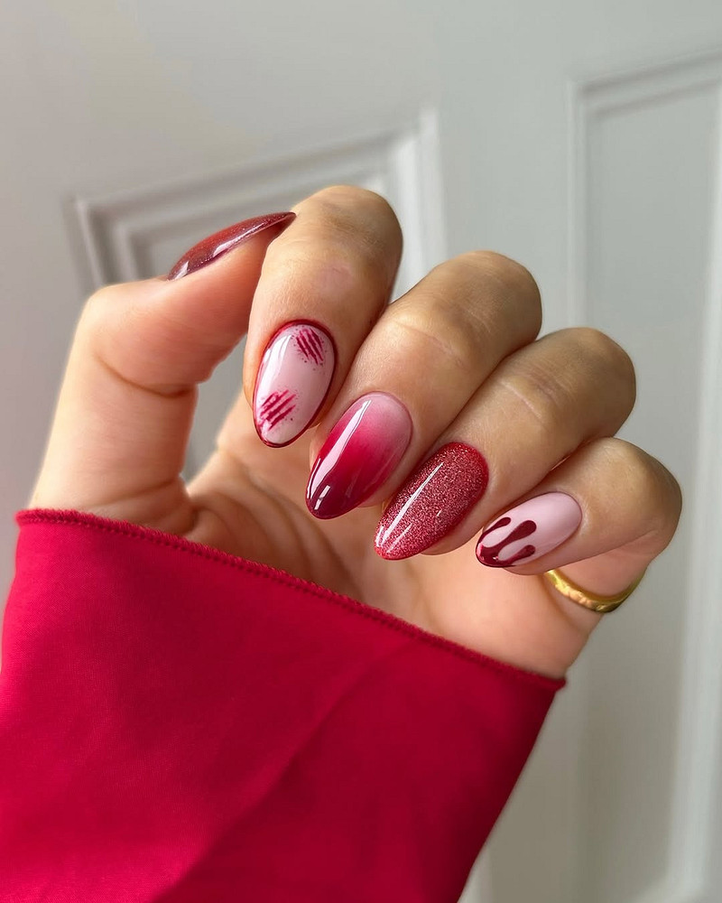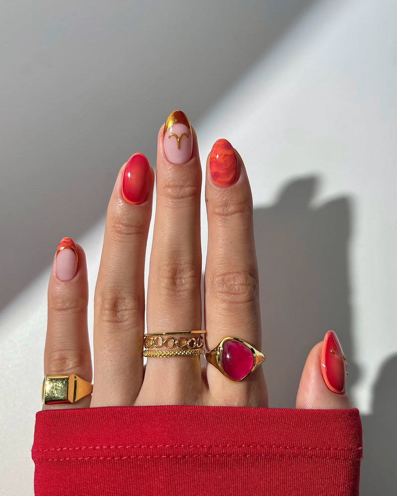 Красные ногти самодостаточны, но если хочешь добавить сложности, попробуй акценты. Золотые полоски, черные геометрические узоры, белоснежные снежинки на одном-двух ногтях. Или сделай красный омбре — от насыщенного у основания к полупрозрачному на кончике. Любые твои идеи будут уместны, если качество исполнения на высоте.
