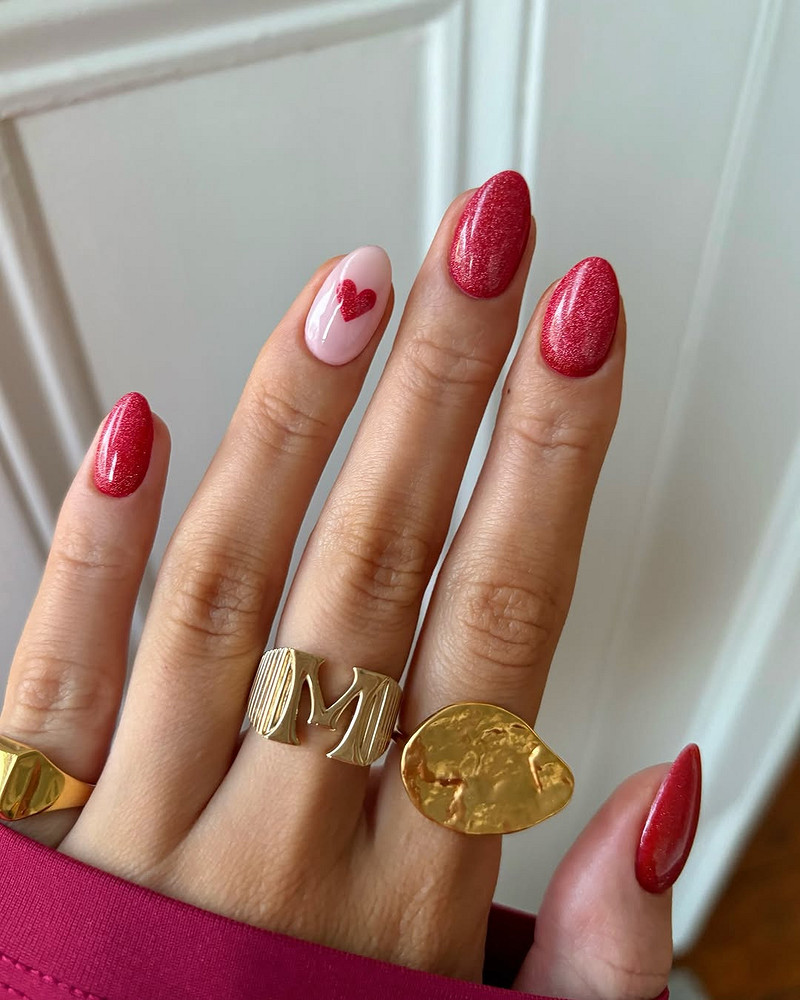 «Кошачий глаз» — покрытие, которое создает эффект переливающейся полоски света, как у настоящего камня. Выглядит дорого и загадочно, особенно в темных оттенках: изумрудном, сапфировом, винном. Под разным углом дизайн играет по-новому, ловит свет и создает объем. Никаких дополнительных украшений не нужно, само покрытие невероятно яркое и обращающее на себя внимание.