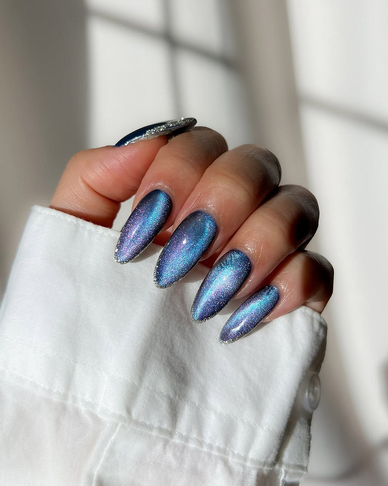 А теперь к магии. Есть особая категория покрытий, которые выглядят так, будто из них вот-вот польется волшебство. «Кошачий глаз», хамелеоны, дуохромы, жемчужные переливы — все это моментально превращает твои ногти в самые красивые на новогодней вечеринке.