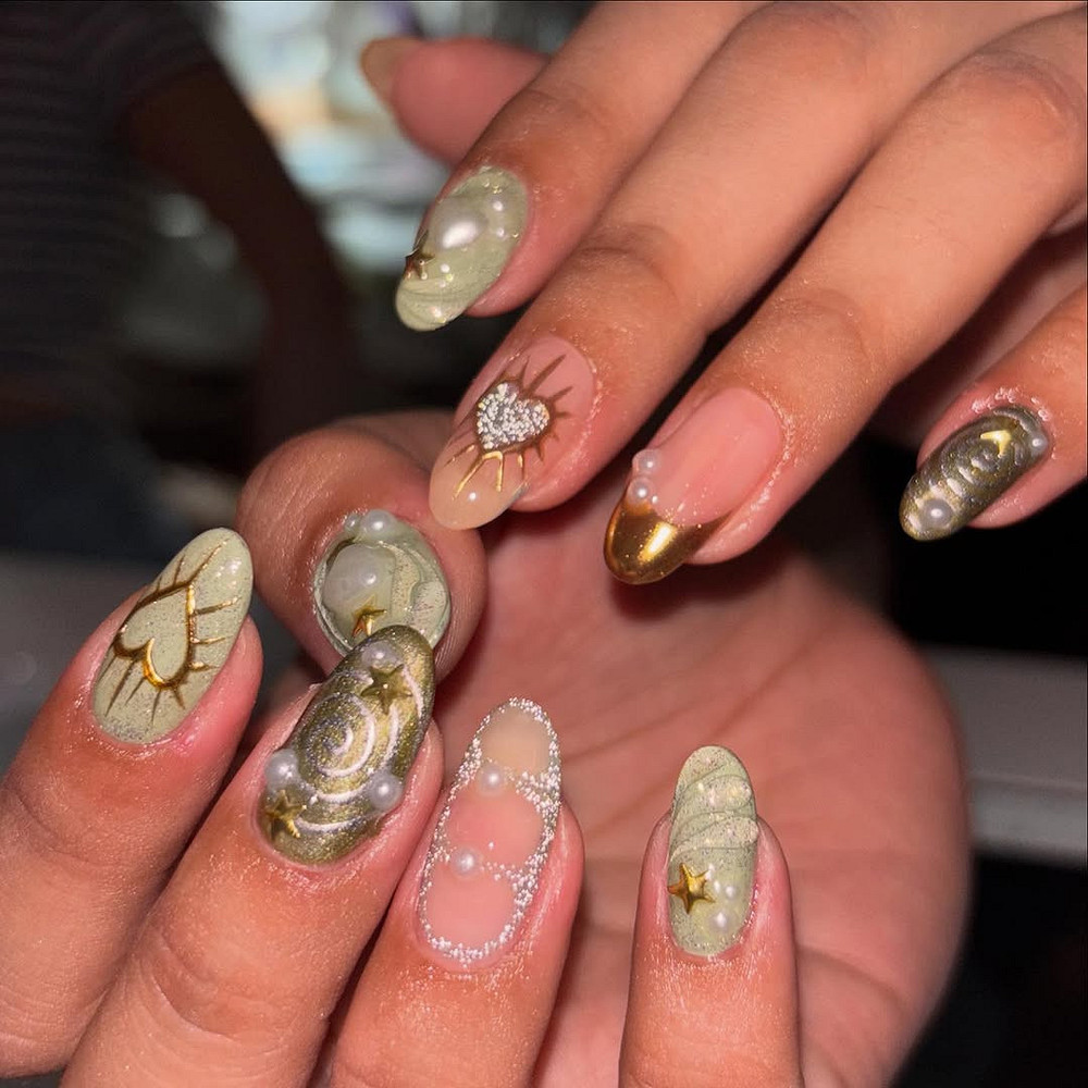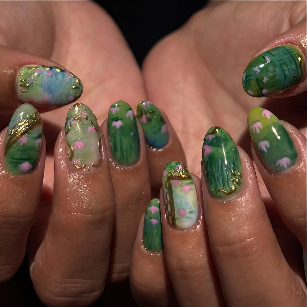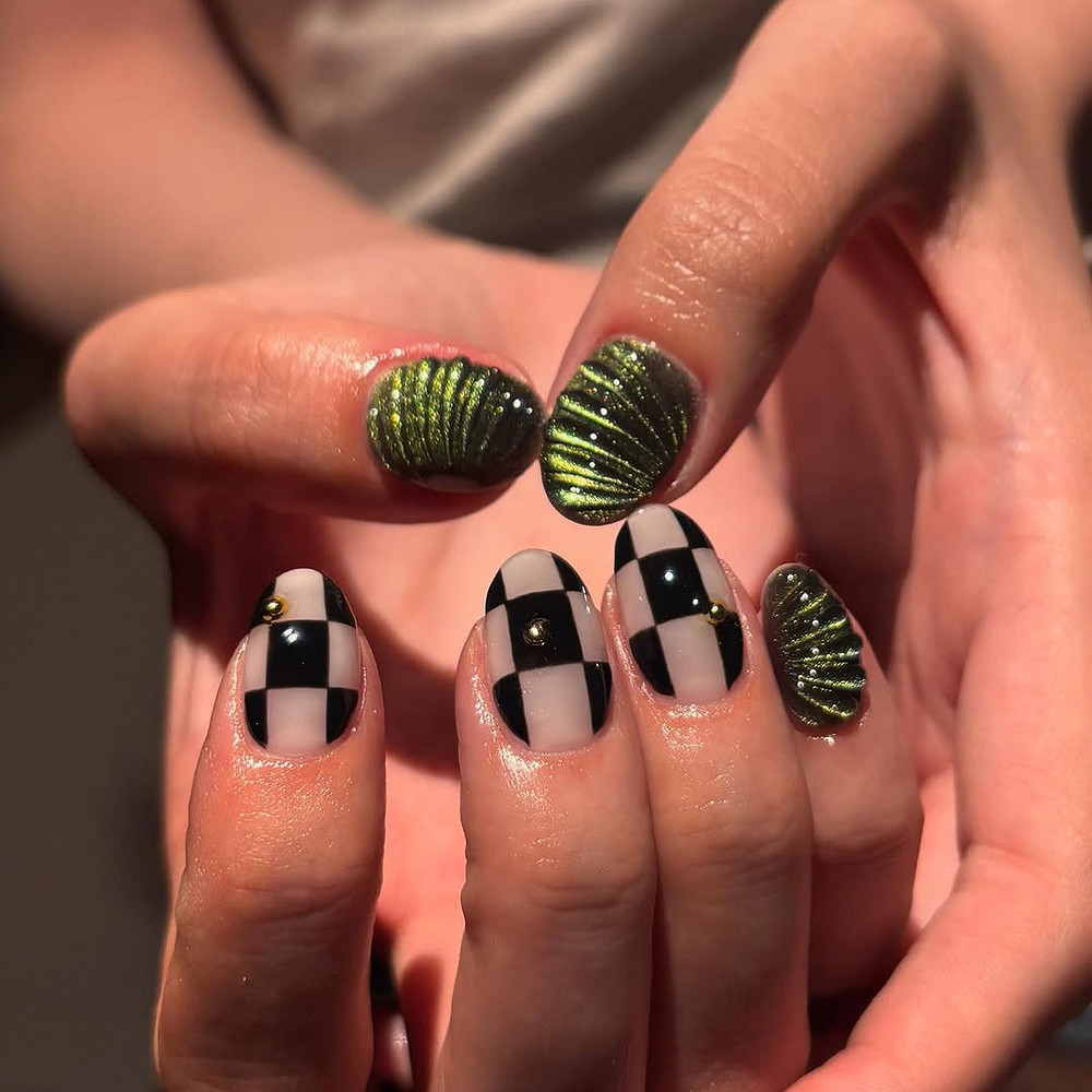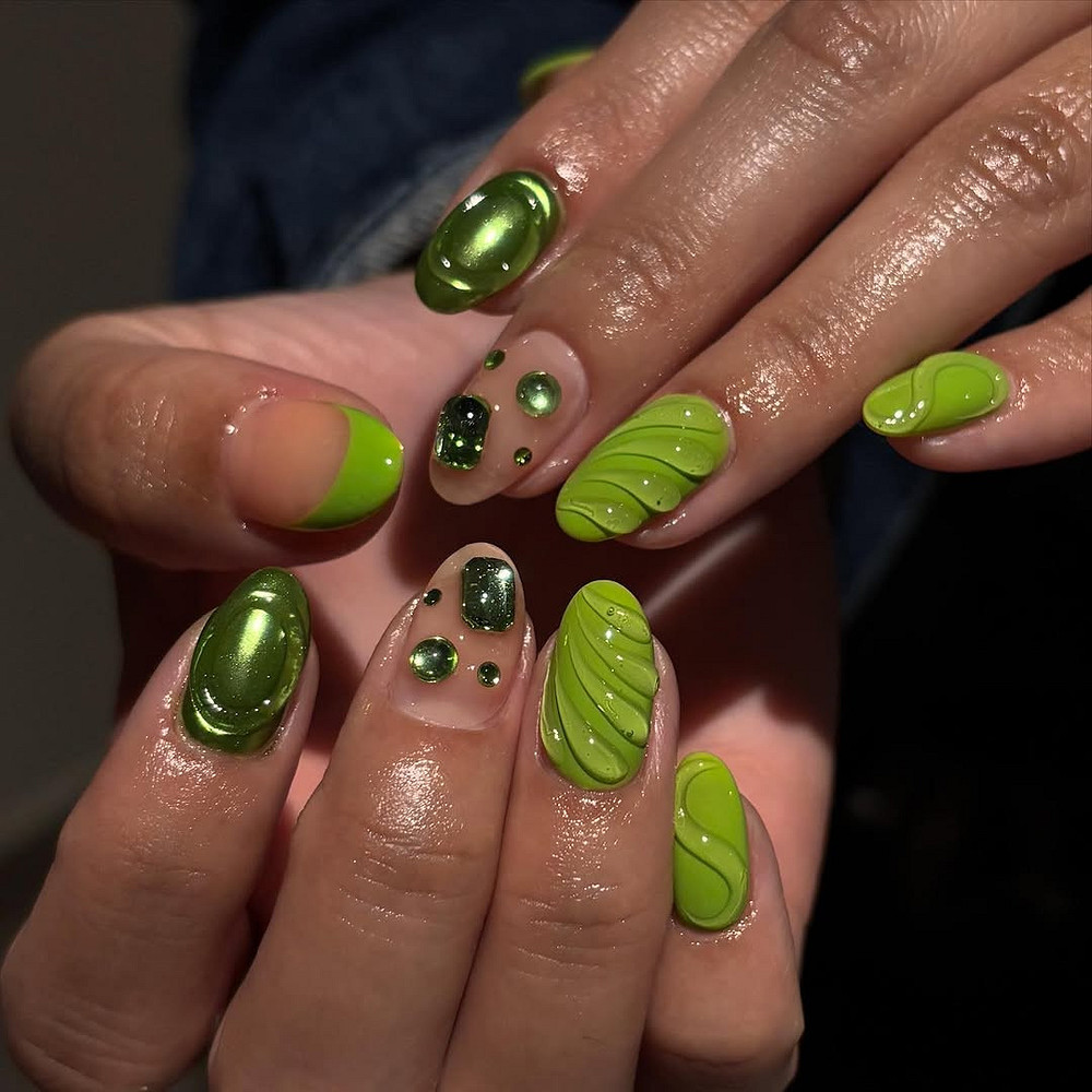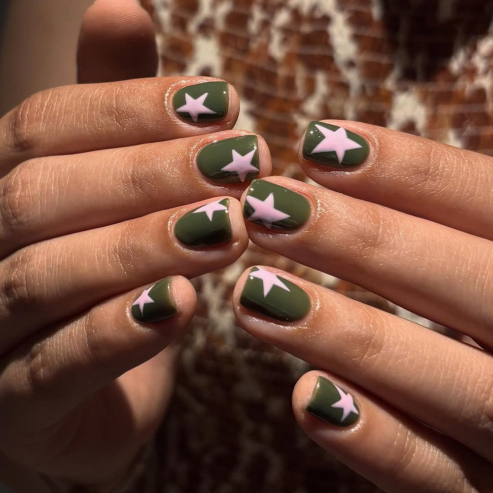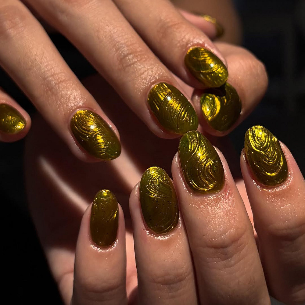 Оливковый, хаки, зеленый мох, травяной — все эти оттенки выглядят стильно и небанально. Но какой маникюр делать на Новый год 2026, решать, конечно, только тебе. Поэтому если хочется больше яркости, то имей в виду, что изумрудный тоже имеет право на существование, особенно если ты добавишь к нему золотые акценты.