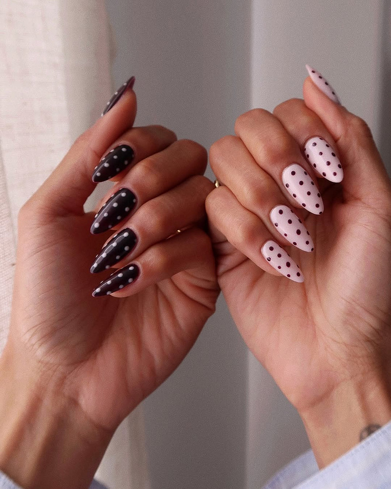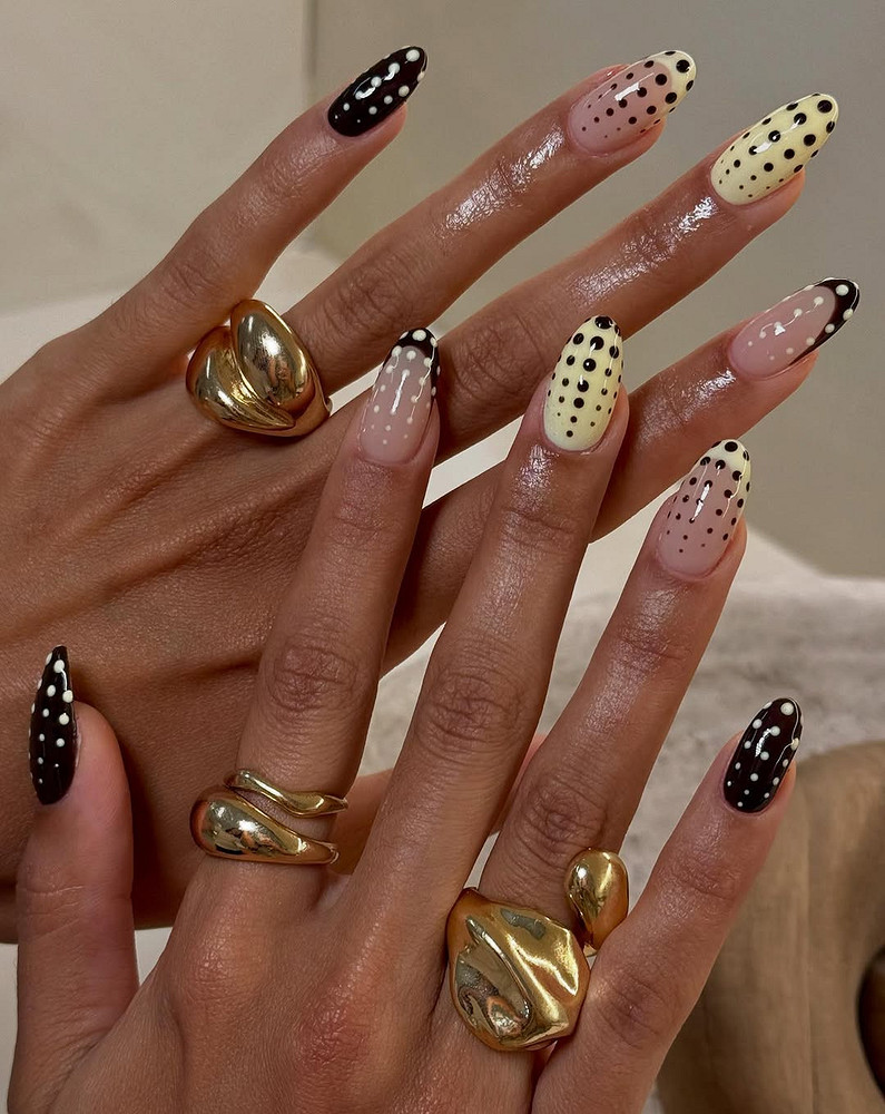 Круто выглядит асимметричный горошек, когда точки разного размера хаотично расположены на ногте. Это добавляет динамики и современности. Или градиент из точек: когда у кутикулы они мелкие и частые, а к кончику становятся крупнее и реже. Получается очень графично и стильно.