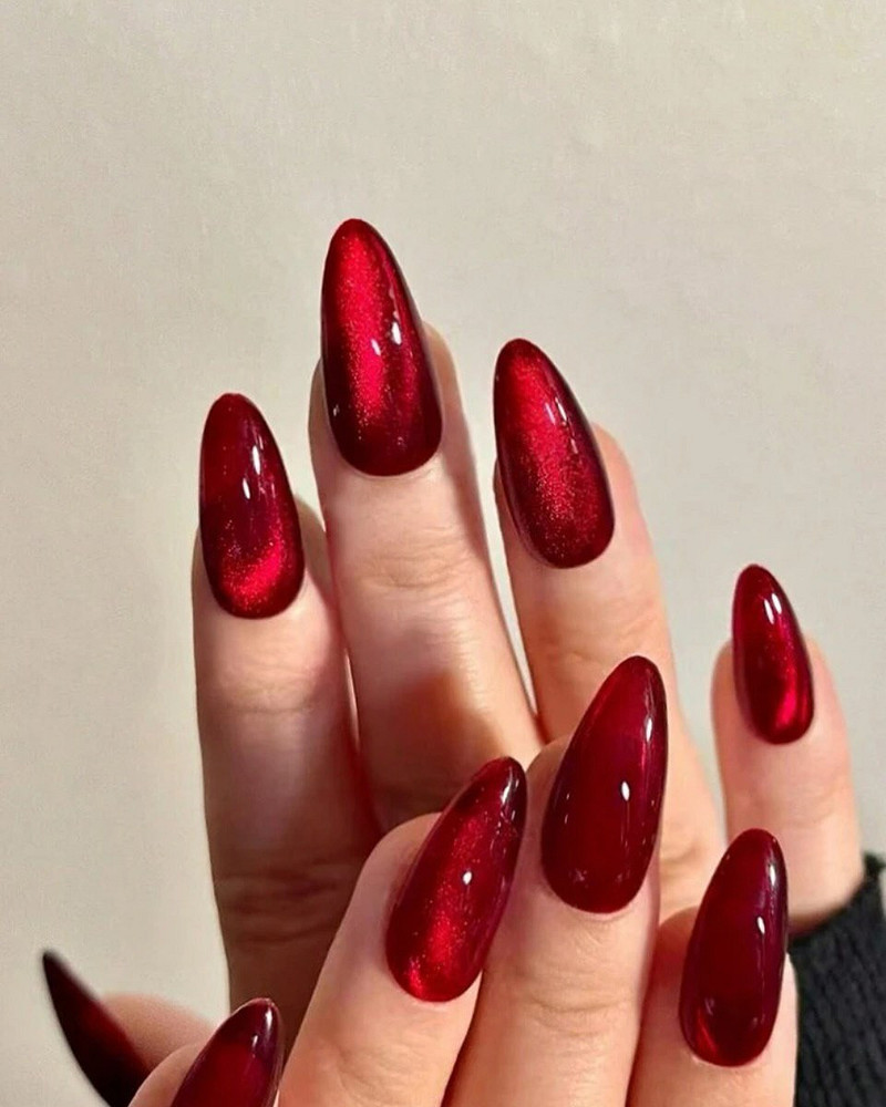 Металлические текстуры — не тренды, но целая религия в 2026 году. И речь не о серебристой эмали из 90-х, а о сложных хромированных покрытиях, которые переливаются всеми цветами радуги в зависимости от освещения. Если планируешь делать маникюр в 2026-м на миндаль, то дизайн ногтей с металлическим эффектом — прекрасный выбор.