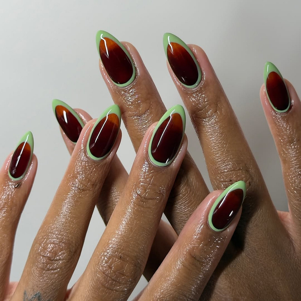 Классический градиент (от темного у кутикулы к светлому на кончике или наоборот) тоже никуда не делся, но теперь его часто делают в неожиданных цветовых сочетаниях. Например, из изумрудного в черный, из шоколадного в карамельный, из неонового розового в персиковый.