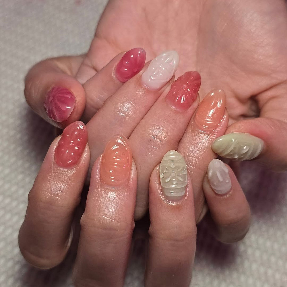 Цветовая палитра желейных ногтей, как правило, включает пастельные и ягодные оттенки: персиковый, розовый, лавандовый, мятный, молочно-карамельный. Они выглядят настолько аппетитно, что руки сразу хочется сфотографировать при естественном освещении, чтобы передать всю эту прозрачность и глубину цвета.