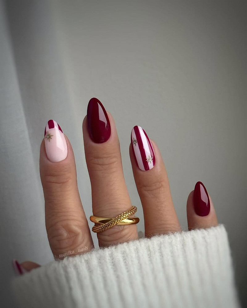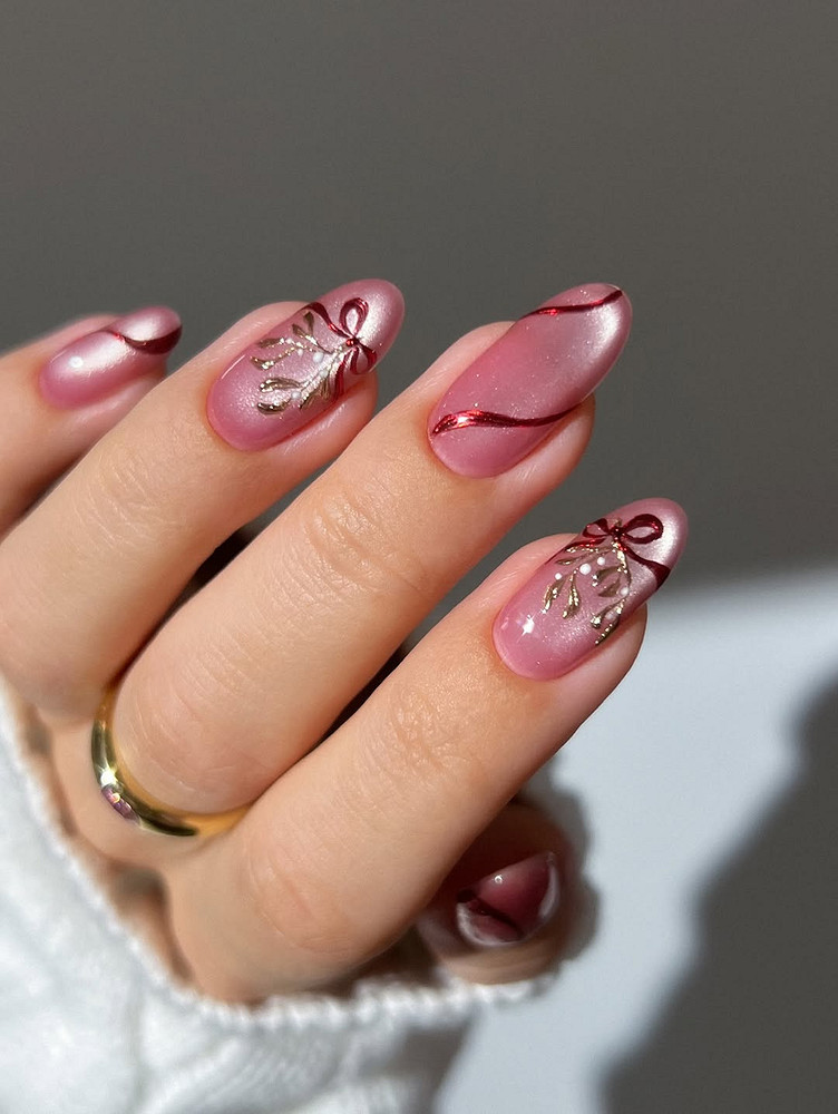 Тонкие золотые полоски вдоль кутикулы или по краю ногтя — элегантный способ разбавить монохромность. Например, ты берешь красный матовый лак, добавляешь одну золотую линию… И вот на твоих ручках уже не просто красные ногти, а продуманный арт.