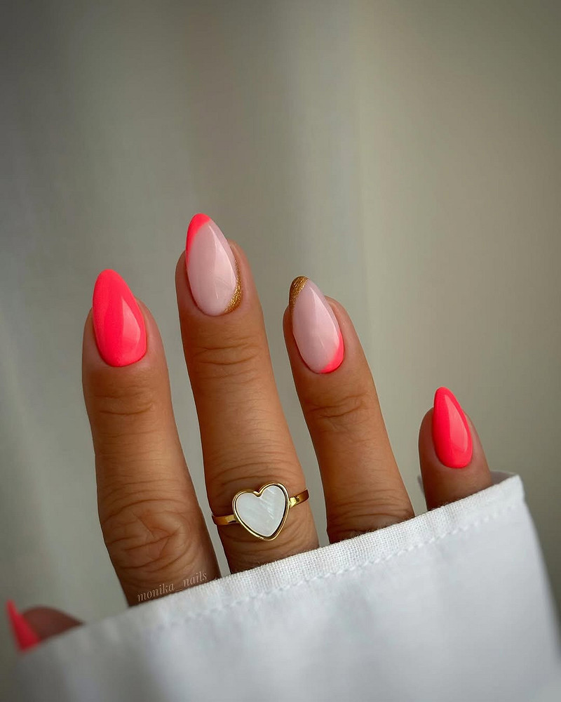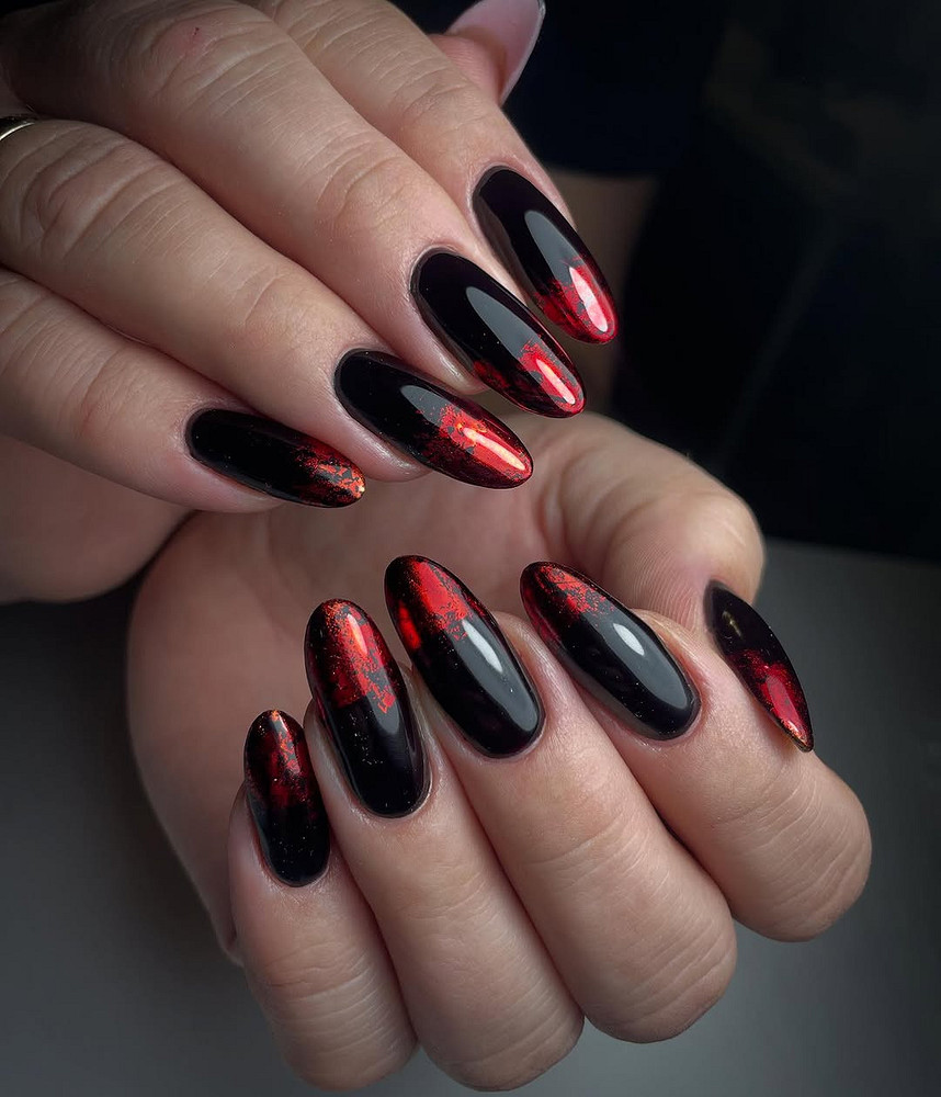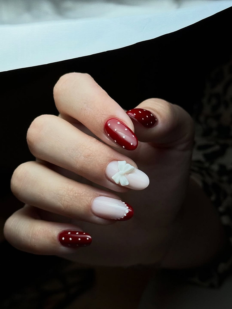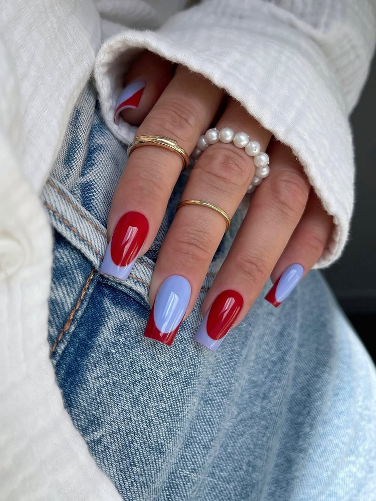 Омбре и градиент — плавный переход от одного оттенка красного к другому или от красного к другому цвету. Это может быть вертикальный градиент (от кутикулы к кончику) или горизонтальный (от ногтя к ногтю).