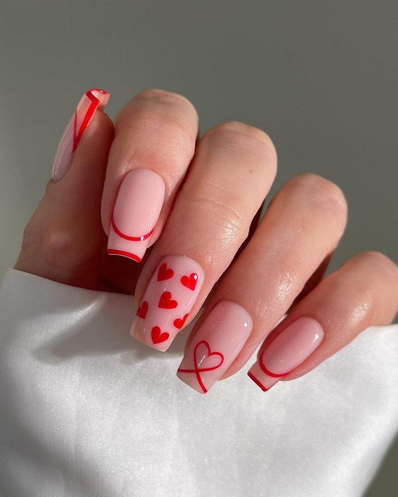 Тонкие черные линии на красном — классика современного минимализма. Один-два штриха, создающие геометрический узор, — и обычный красный маникюр превращается в произведение искусства. Идеи красного маникюра 2026 часто строятся на таких простых, но эффектных решениях.