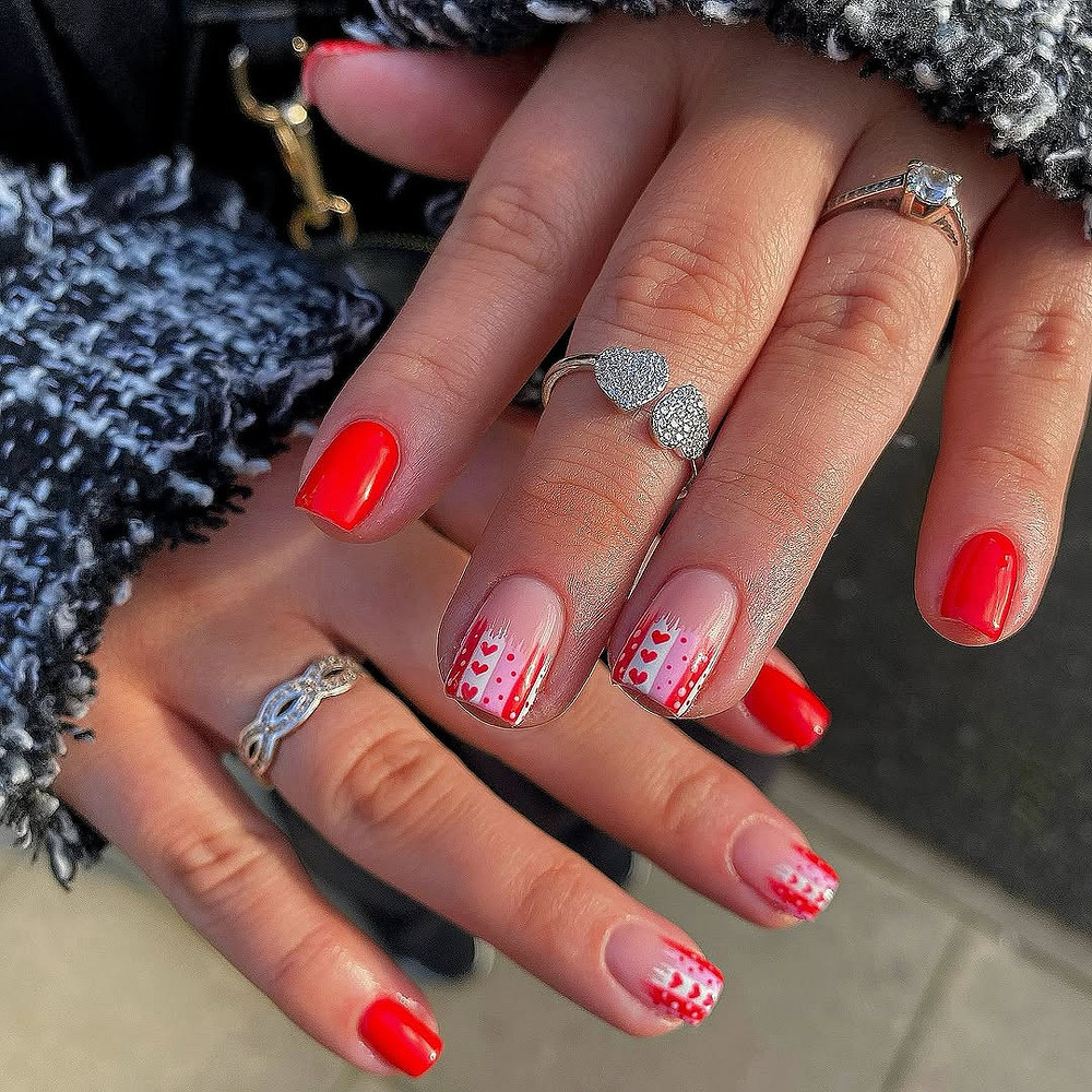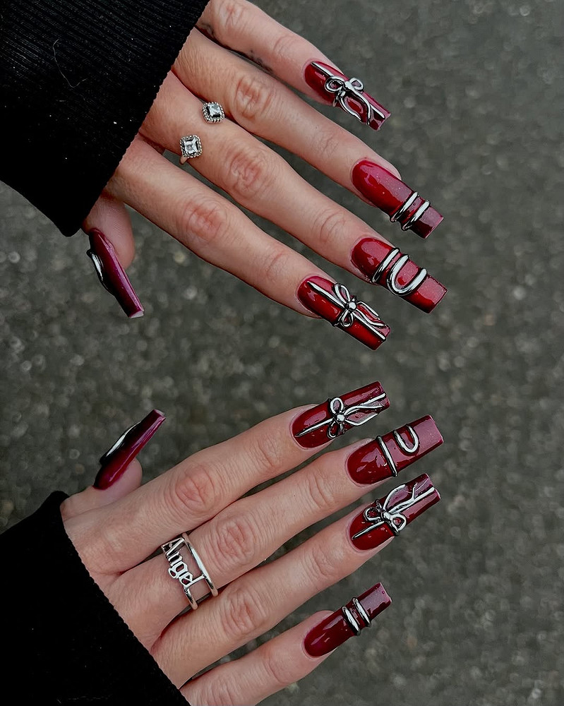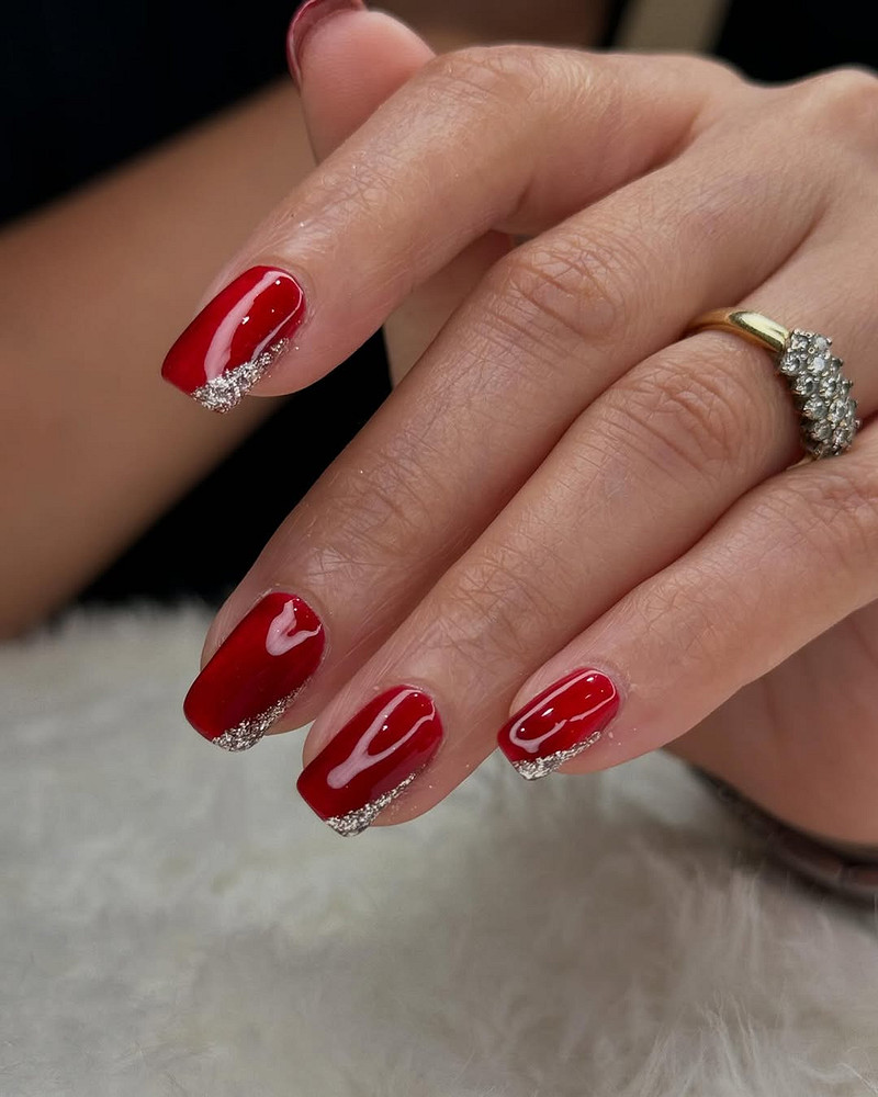 Красный с серебром — более холодная и футуристичная альтернатива золоту. Серебряные акценты делают красный маникюр более современным и подходят для повседневной носки. Можно использовать серебряную фольгу, глиттер или металлический лак для прорисовки узоров.