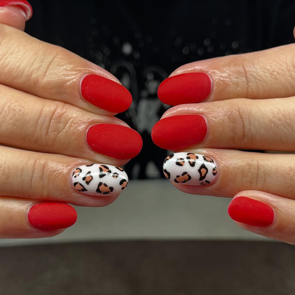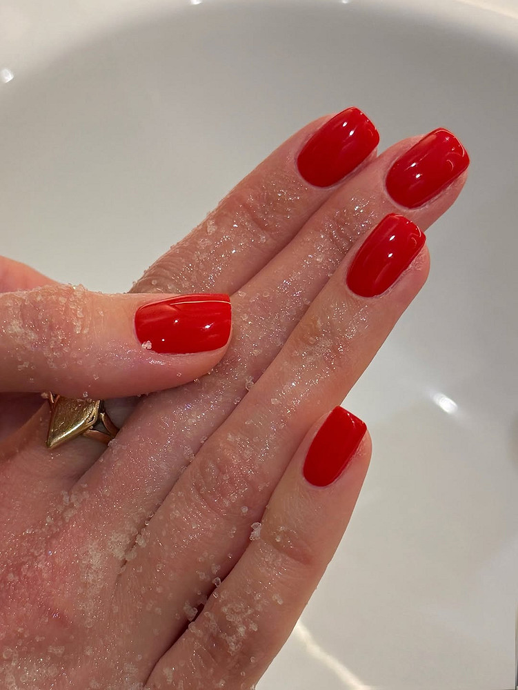 Бархатный эффект также попадает в новинки нейл-индустрии, которые уже есть во всех топовых салонах. Это не совсем матовое покрытие, а скорее очень нежная, почти текстильная поверхность. На красном цвете такой финиш выглядит невероятно роскошно, особенно на коротких ногтях.