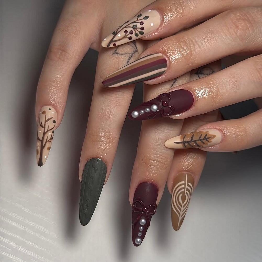 Темный вишневый — почти черный, но все еще красный. Этот цвет для вечерних выходов, для тех моментов, когда хочется выглядеть загадочно и чуть опасно. Он работает на длинных ногтях любой формы и особенно эффектно смотрится с глянцевым покрытием.