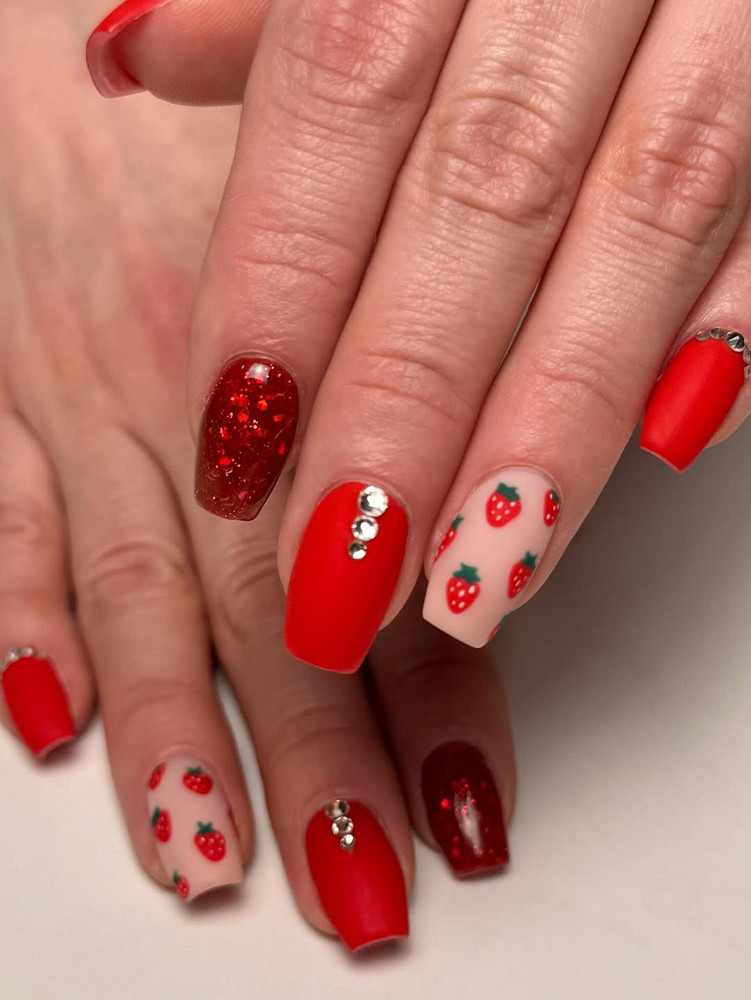В то же время красный маникюр с дизайном в 2026 году — не обязательно ровное покрытие, а в том числе игра с текстурами и спецэффектами.