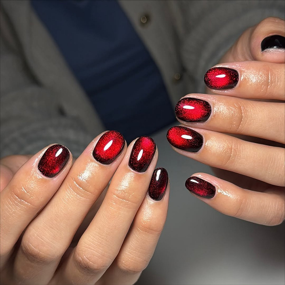 Magnetic-эффект — когда в гель-лаке есть металлические частицы, которые под воздействием магнита создают волнообразный рисунок или эффект кошачьего глаза. На красном это выглядит особенно драматично и дорого.