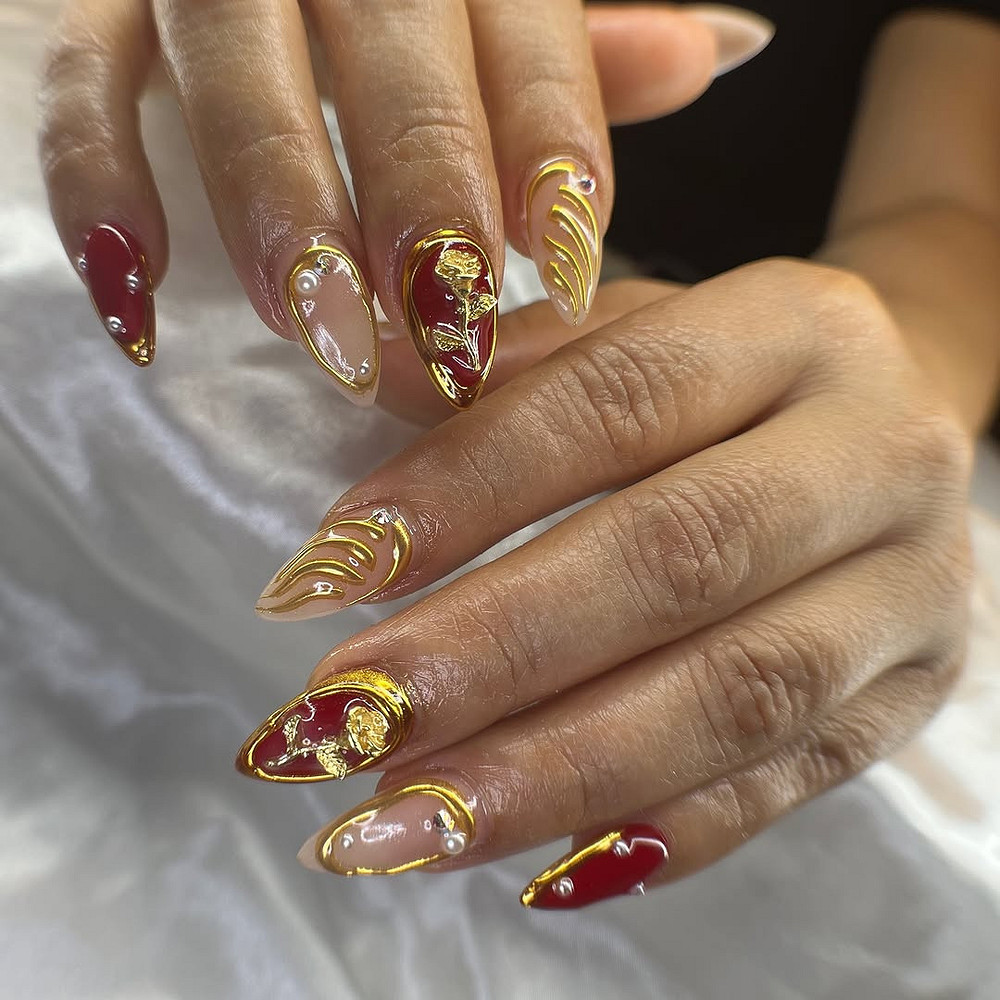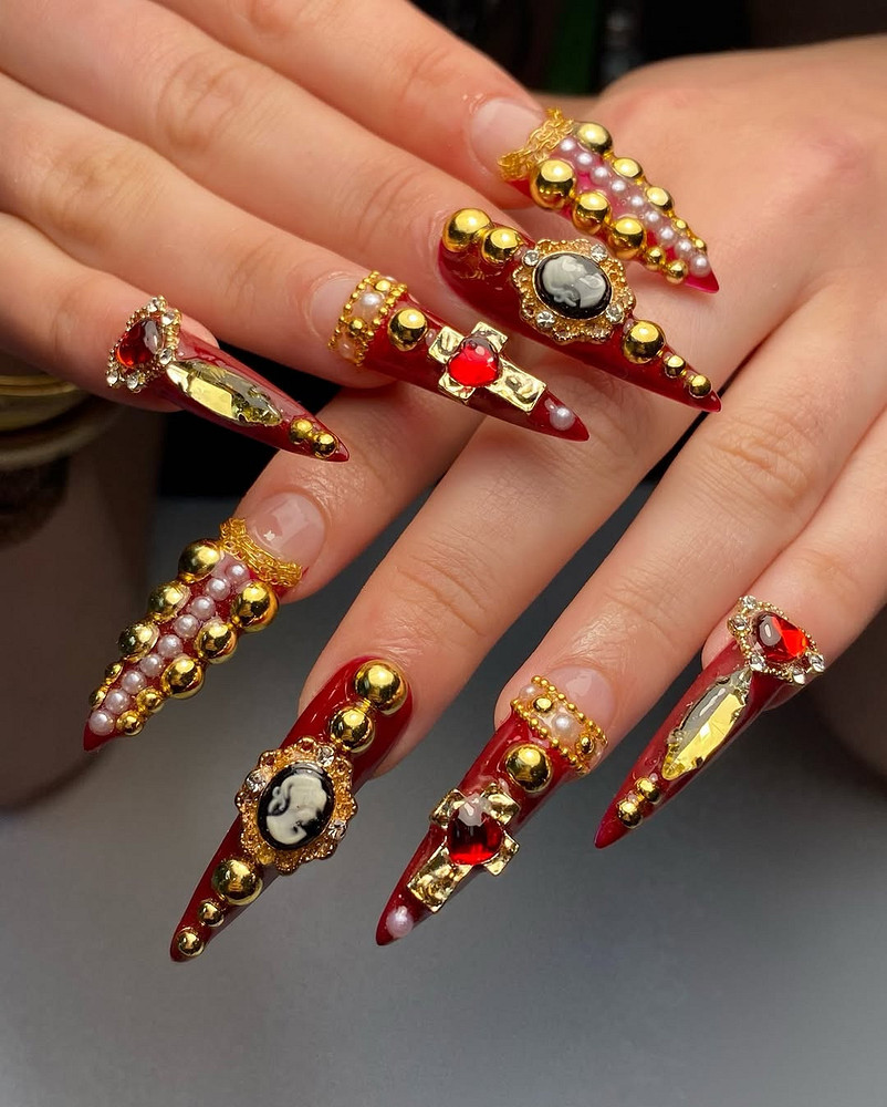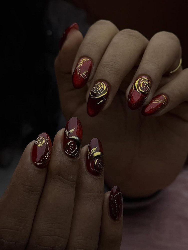 Если посмотреть на дизайн ногтей 2026 и красный маникюр, то становится очевидно, что его невозможно представить без золотых акцентов. Это сочетание настолько беспроигрышное, что работает даже в самых минималистичных вариантах.