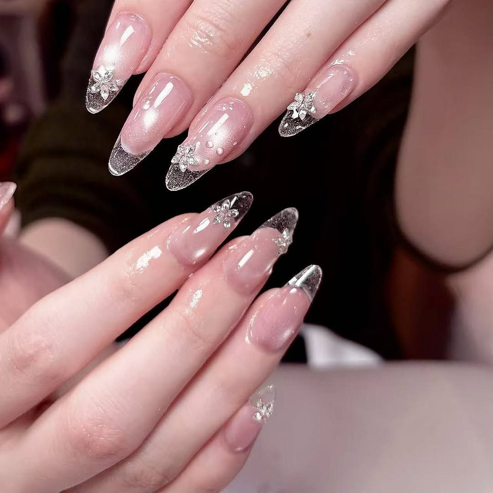 Техника простая: база, два слоя полупрозрачного гель-лака, толстый слой глянцевого топа. Важно, чтобы покрытие было идеально ровным — на glass nails видно каждую неровность. Форма квадрат здесь проигрывает: острые углы разбивают световой поток. Лучше выбирай мягкий миндаль или округлые острые — тогда блики будут скользить по поверхности, как по настоящему стеклу.