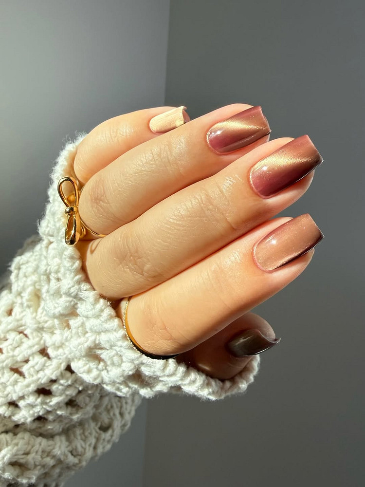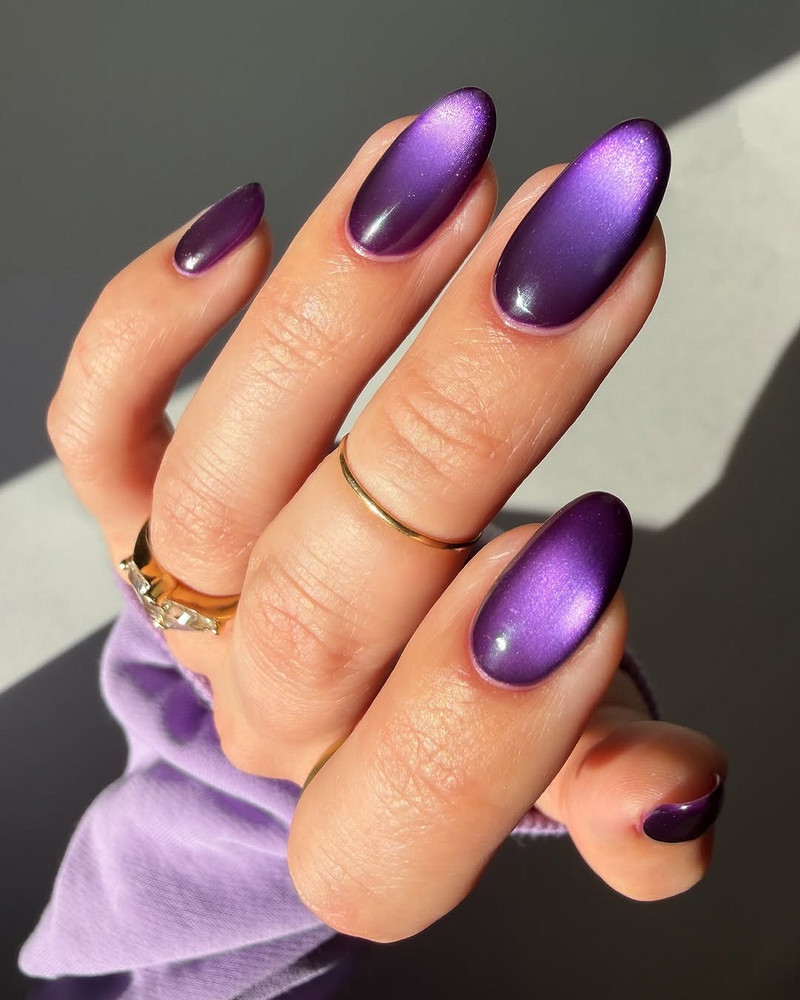 Если у тебя миндалевидные ногти, попробуй сделать cat-eye только на среднем и безымянном пальцах, остальные покрой матовым вельветом в тон. Получится красивый баланс между акцентом и сдержанностью.