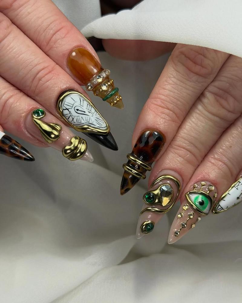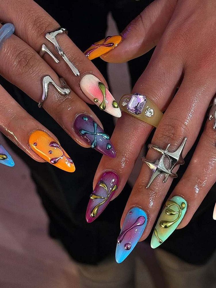 Нейл-мастера создают 3D-эффекты через наслоение: сначала базовое покрытие (часто нюдовый или молочный оттенок), потом точечный объем, который запекается в лампе, сверху — финишное покрытие для закрепления. Важно, чтобы декор не мешал в быту: если ты печатаешь по восемь часов в день, огромные капли будут раздражать.