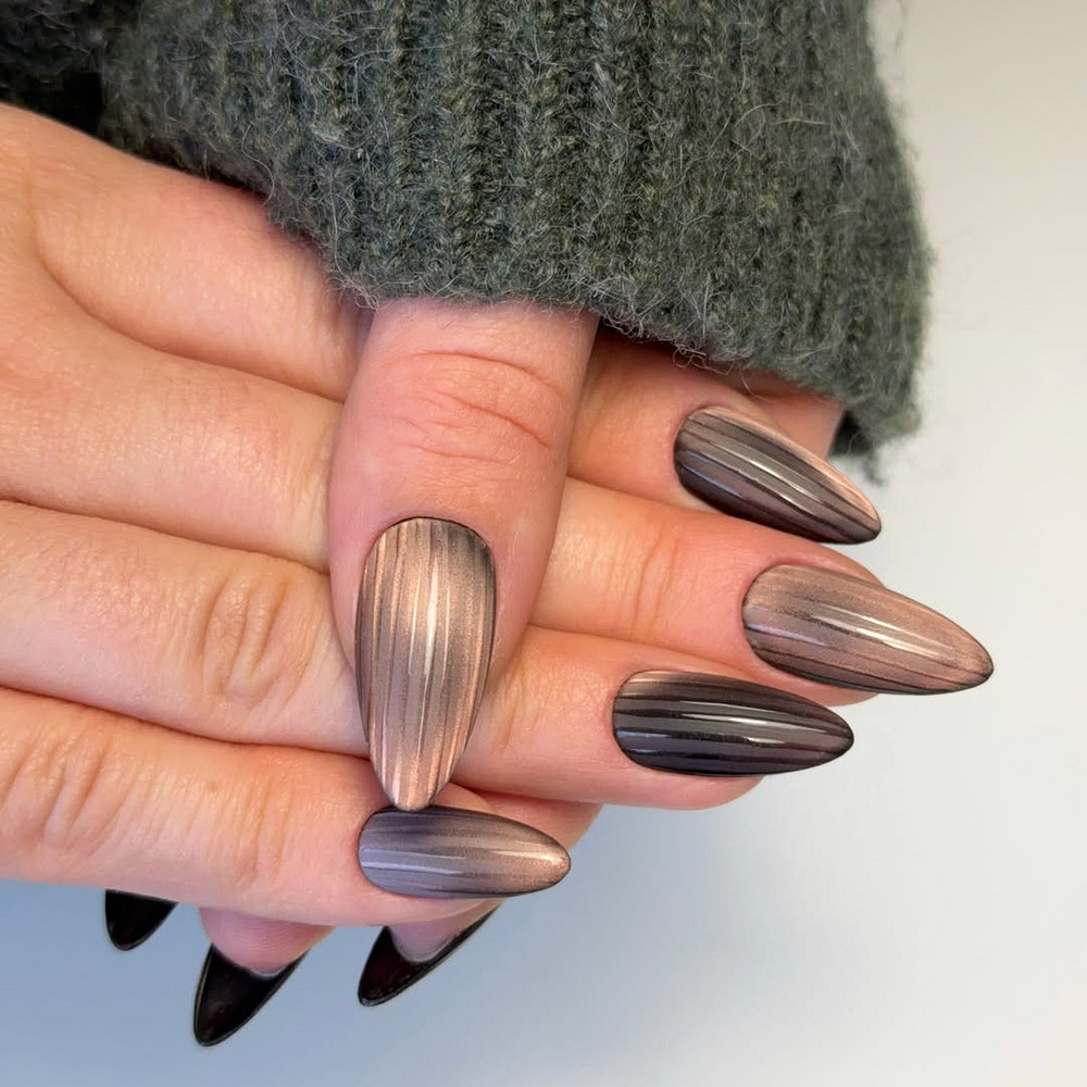 Нейл-мастера работают с этой техникой через слои: сначала база темного оттенка (графит, черный шоколад, слива), потом магнитный гель, который «рисует» переливы, сверху — бархатный топ. Получается объемный эффект, который особенно выигрышно смотрится на длине.