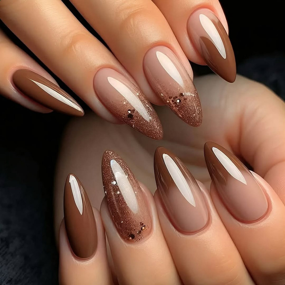 Такая палитра особенно выигрышно смотрится на длинных ногтях с формой стилеты или мягкий миндаль. Нейл-мастера советуют не бояться темных оттенков — горький шоколад, мокрый асфальт, оливковый хаки на длине выглядят не мрачно, а утонченно. Можно играть с финишами: матовый топ делает цвет еще глубже, а легкий сатиновый блеск добавляет мягкости.