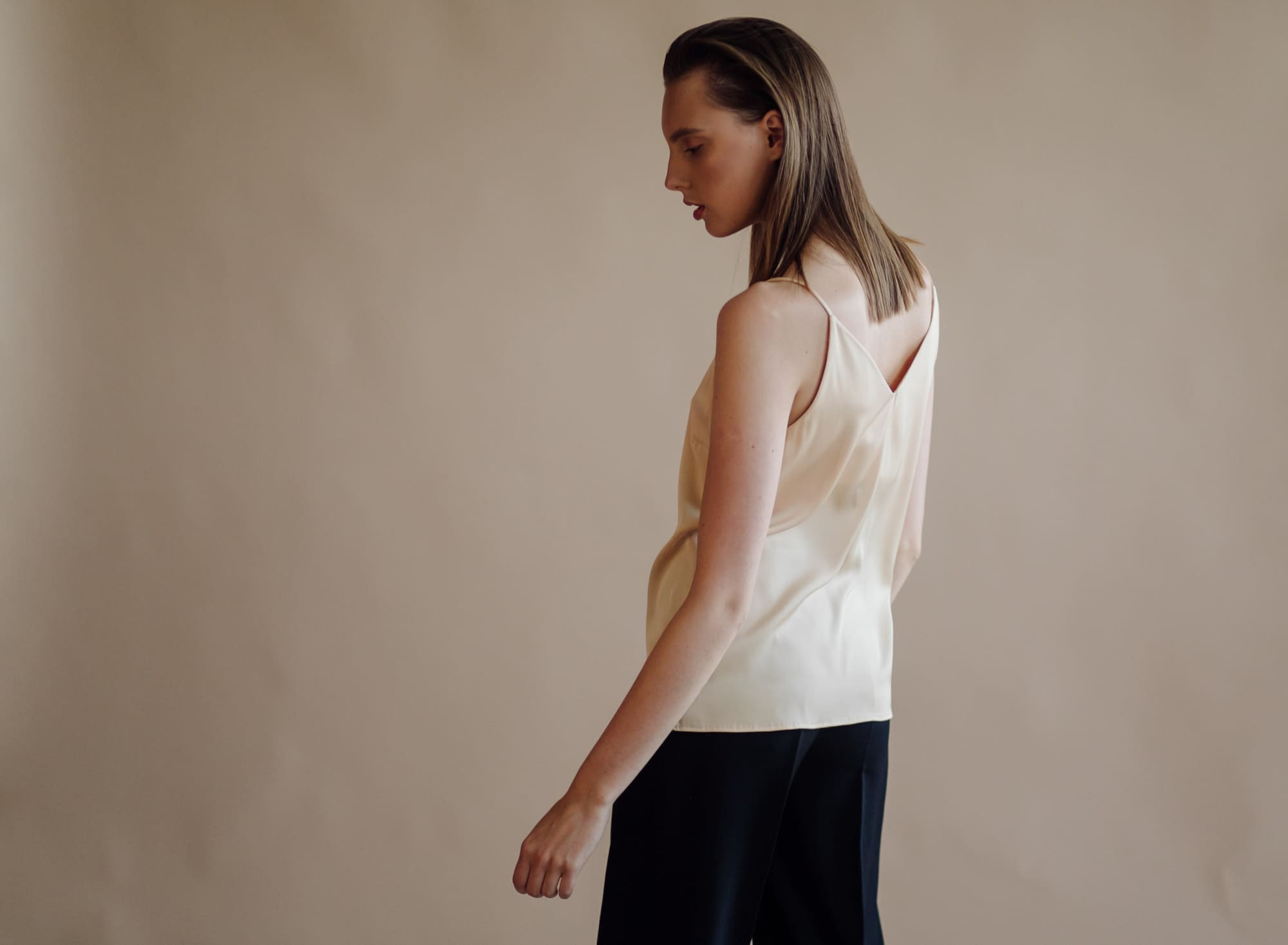 Профессиональная тонкость: слегка подай переднее плечо вперед, а голову поверни в сторону камеры. И не забывай про руки, они не должны висеть как плети. Одну можешь положить на бедро, вторую — слегка отвести от тела.
