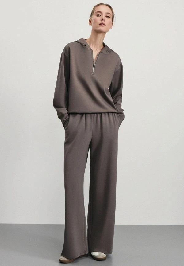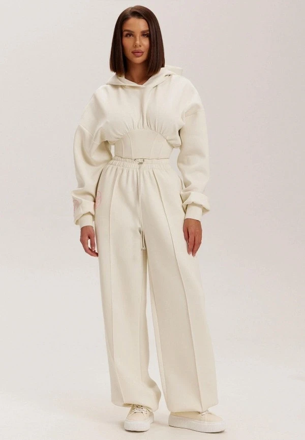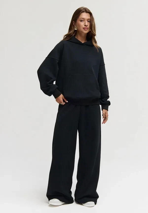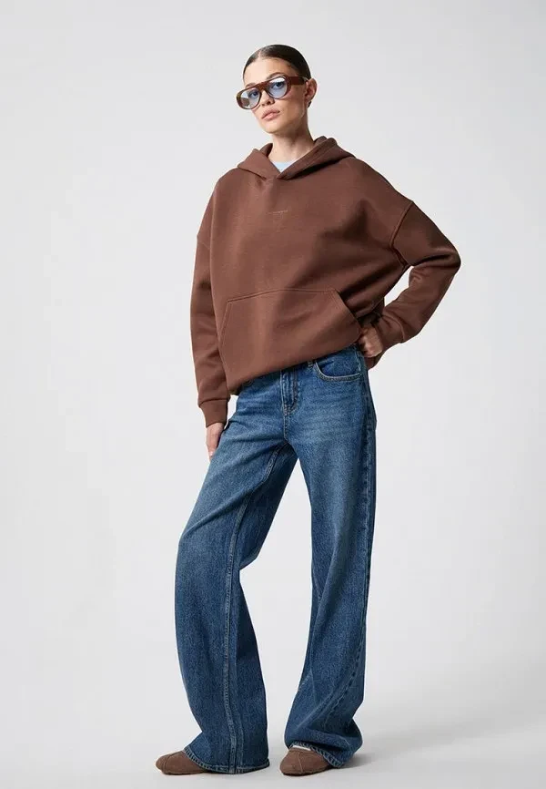 Широкие брюки — отдельная любовь. И в паре с худи они создают образ, который говорит: «Я настолько уверена в себе, что могу позволить себе носить то, что удобно». Выбирай модели с высокой посадкой, чтобы визуально вытянуть силуэт, и заправляй в них худи полностью или частично.