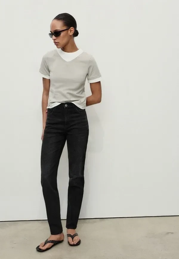 Лайфхак для тех, у кого средняя или низкая посадка джинсов: попробуй полузаправку — передняя часть футболки внутрь, задняя остается снаружи, прикрывая бедра. Это работает на фигуру «груша» или если ты хочешь сбалансировать пропорции без лишнего акцента на бедрах.