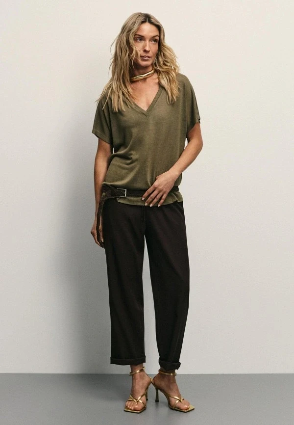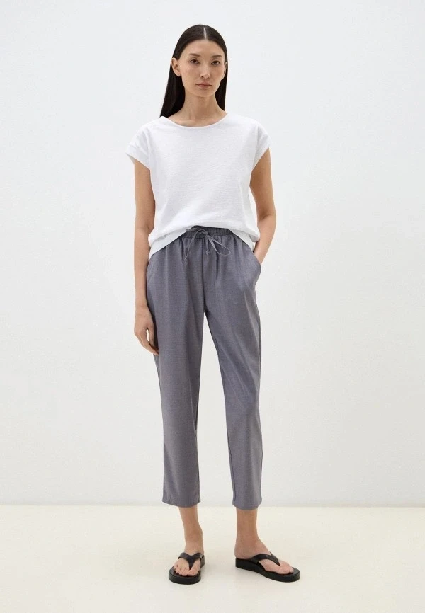 Если у тебя классические брюки со стрелками, заправляй футболку полностью и ровно, без складок. Добавь тонкий ремень — это не только функционально, но и создает четкую горизонтальную линию на талии, что визуально вытягивает силуэт.