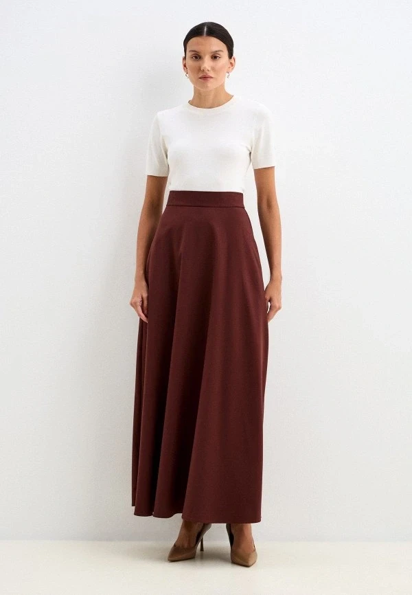 Если у тебя миди-юбка А-силуэта, заправь футболку полностью — это подчеркнет талию и легко создаст классическую форму «песочных часов». Не бойся немного вытянуть ткань из-под пояса: легкий напуск смягчает образ и не дает ему выглядеть слишком формально.