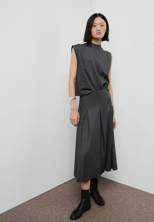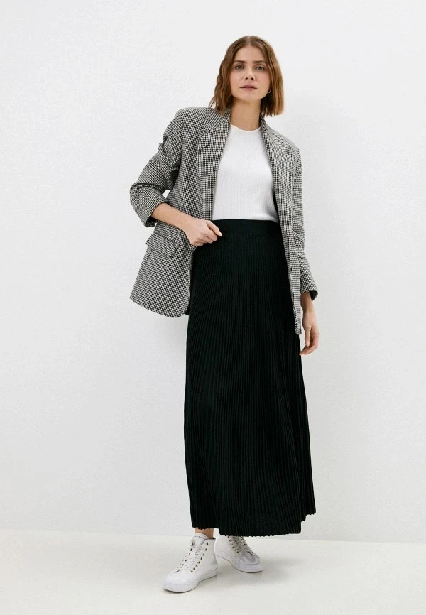 Для плиссированных или многослойных юбок заправь только переднюю центральную часть футболки, а бока оставь свободными. Это создает объем там, где нужно, и структурирует там, где важна четкость линий. Кстати, рубашка из мягкой и податливой ткани тоже отлично работает с этим приемом.