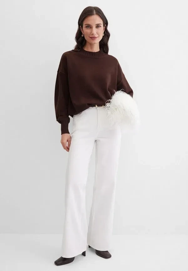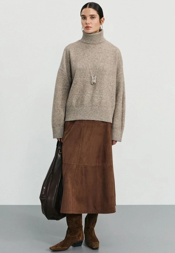 Главное правило: если верх облегающий, низ должен быть свободным. Иначе получится слишком перегруженный или, наоборот, старомодный образ. Свитер-лапша отлично сочетается с классическими брюками, кожаными юбками, широкими джинсами.