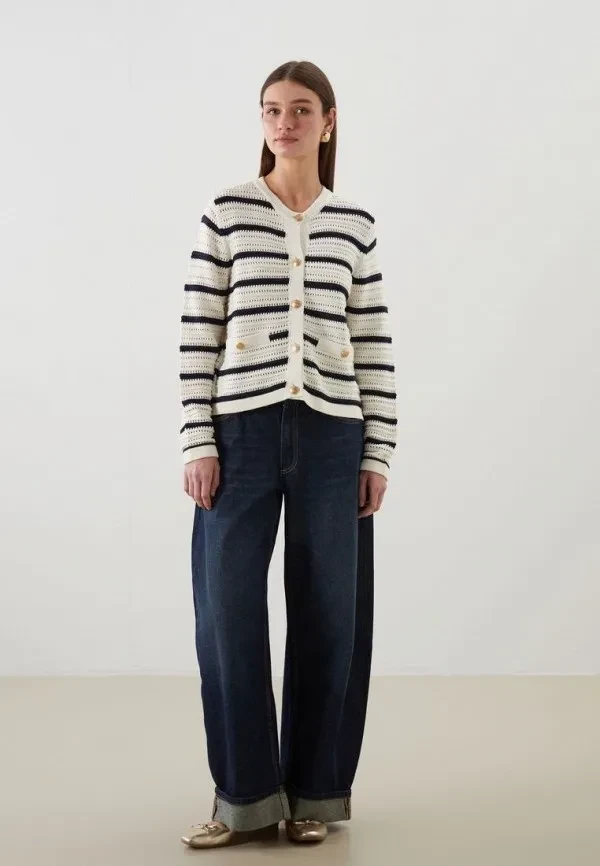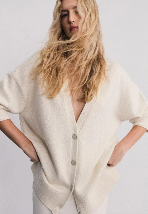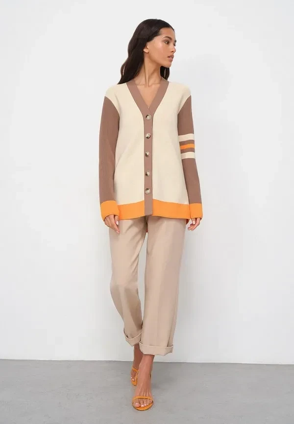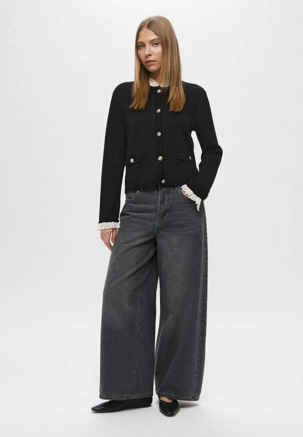 Короткий кардиган хорош тем, что он не скрывает твои пропорции, а наоборот, их выгодно подчеркивает. Особенно если ты выберешь модель с V-образным вырезом — она визуально вытянет силуэт и добавит элегантности. В 2026-м коллекция коротких кардиганов представлена во всех возможных вариациях: на пуговицах, на молнии, с жемчужными украшениями, с контрастными полосами по краям.