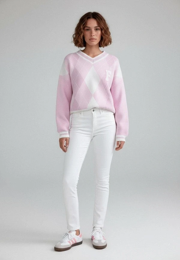 - Свитер в ромб — отсылка к университетской эстетике. Он моментально делает твой лук более продуманным и стильным.
