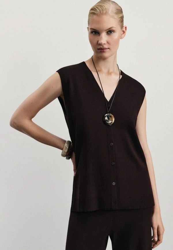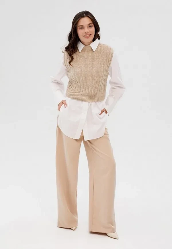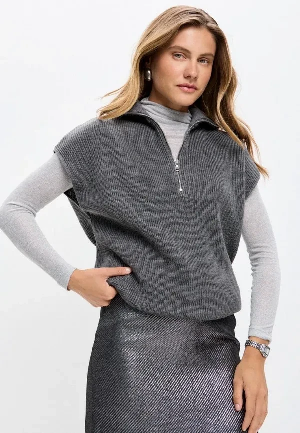 Хотя технически это не совсем свитер, вязаный жилет заслуживает отдельного упоминания, потому что в 2026-м он переживает бум популярности. Жилет можно носить поверх рубашки, водолазки, лонгслива или даже платья. И каждый раз он будет создавать новый образ.