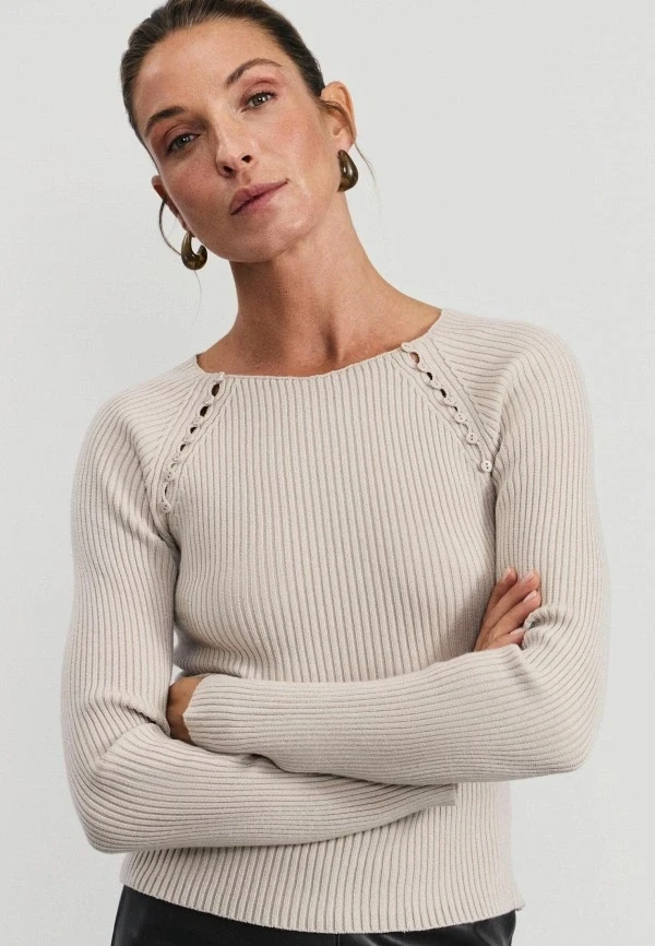 - Бежевый свитер можно носить с джинсами любого цвета, и это всегда будет смотреться гармонично.