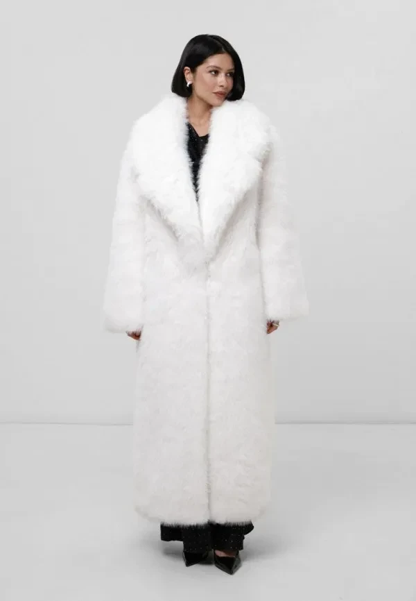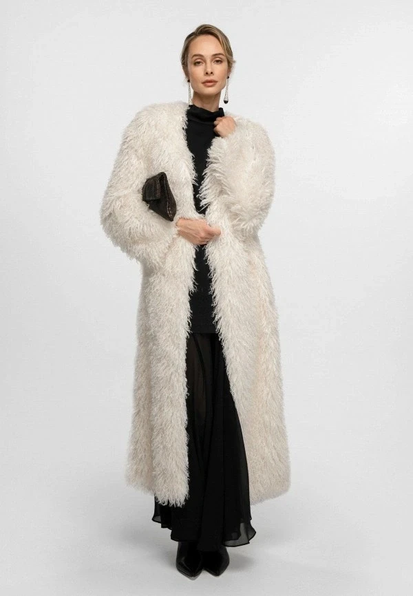 Цветовая гамма — максимально природная: белый, кремовый, серый, бежевый. Никаких кислотных оттенков и принтов, ведь дизайн «йети» работает за счет фактуры, а не цвета. Длина — обязательно макси, желательно ниже колена, а лучше до середины икры или даже до щиколотки. Носить такую шубу нужно с простыми вещами: джинсы, базовые свитеры, минималистичные платья.