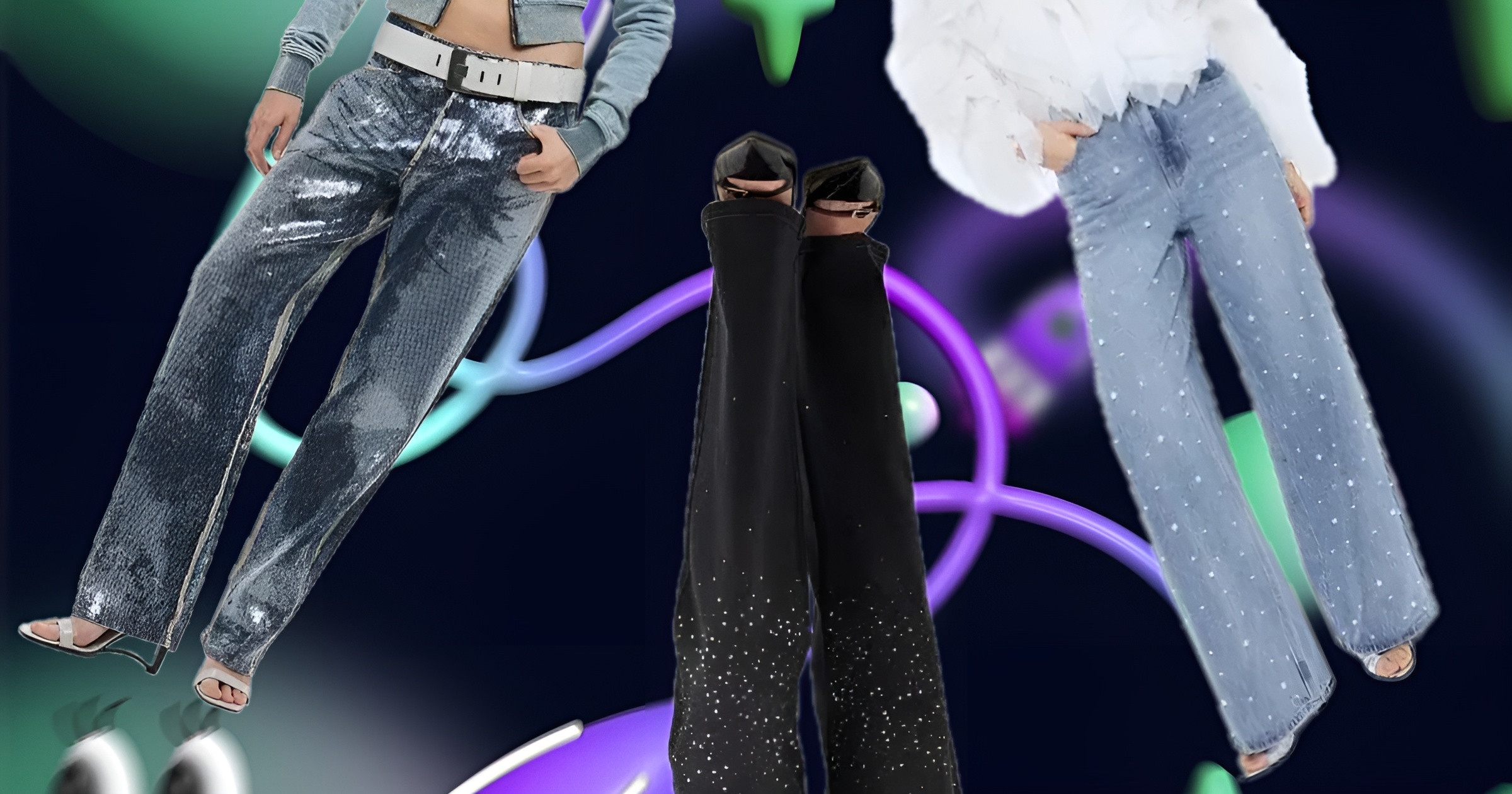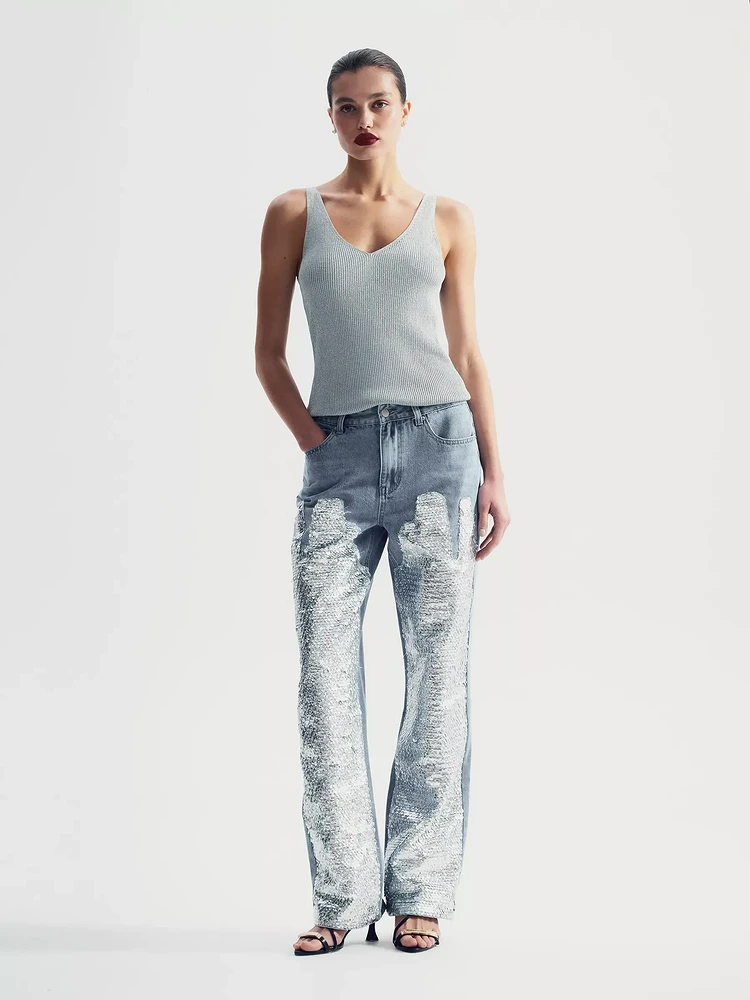 Джинсы с пайетками созданы для вечеринок, где ты хочешь выглядеть празднично, но не чрезмерно. Формула простая: джинсы + шелковая блуза или элегантная водолазка + пиджак + лодочки. Прическа собранная, макияж с акцентом на губы — и ты королева вечера.