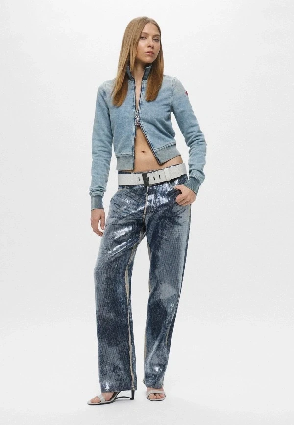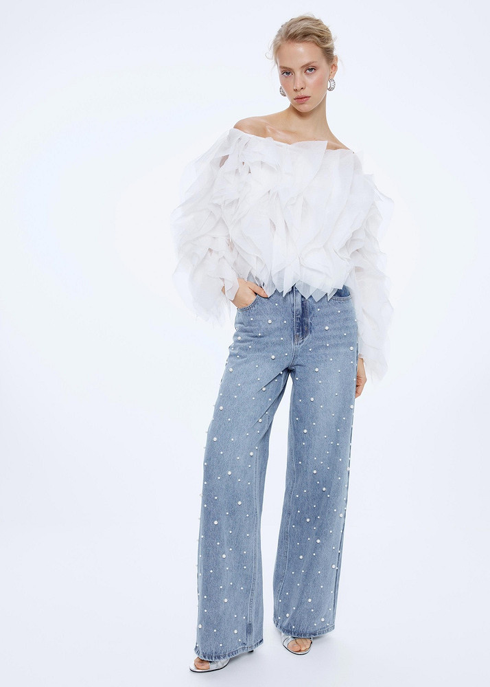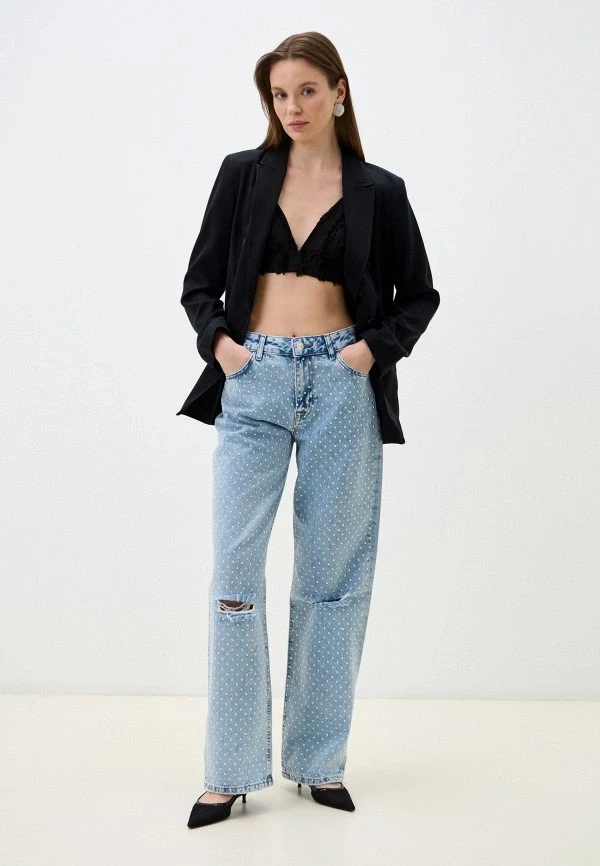 Джинсы со стразами — середина между пайетками и жемчугом. Стразы дают блеск, но более точечный, графичный. Часто их располагают в виде узоров, логотипов или полос вдоль боковых швов. Это вариант для тех, кто не готов к тотальному мерцанию. А еще со стразами проще: они прощают больше ошибок в стилизации и легче вписываются в повседневный гардероб.