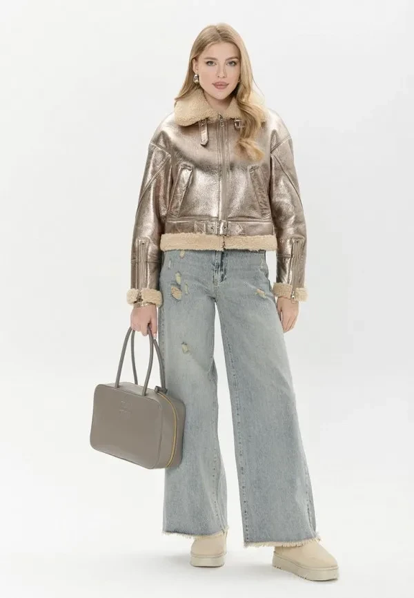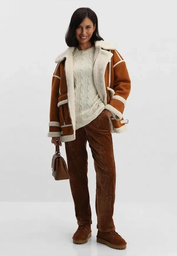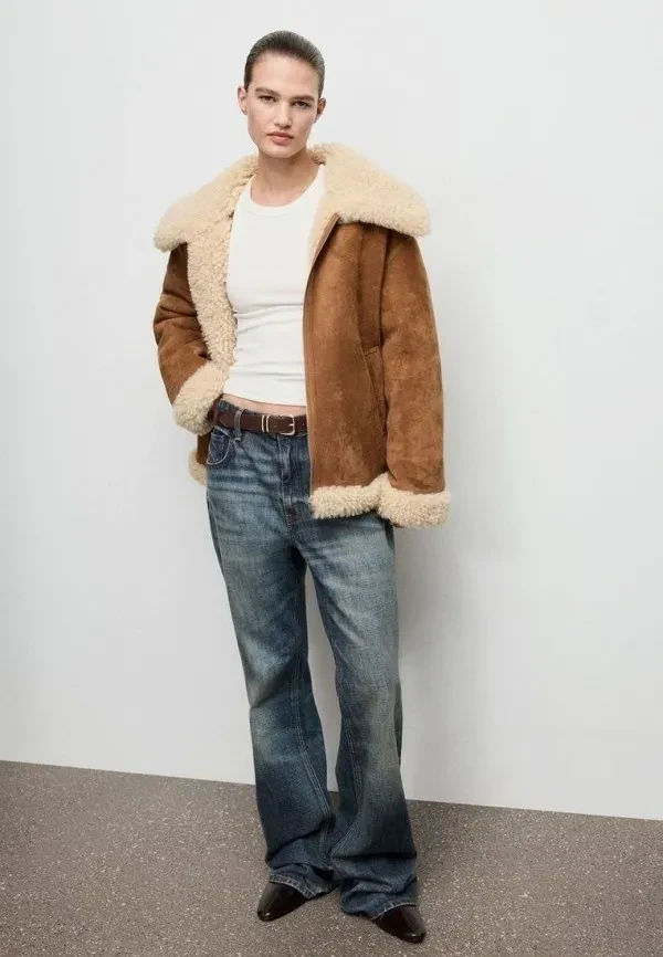Трендовые дубленки 2026 прекрасно подходят для дневных выходов: светлые джинсы, вязаный кардиган, высокие сапоги. Это идеальный вариант, если хочешь уйти от привычной темной гаммы и добавить в гардероб легкости без потери функциональности. И да, пастельный авиатор — один из тех трендов, который очень эффектно смотрится на фотографиях (имей в виду, если жить не можешь без романтичных фото с елочкой или зимних селфи).
