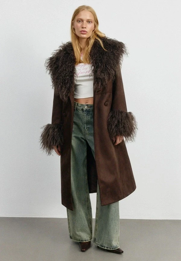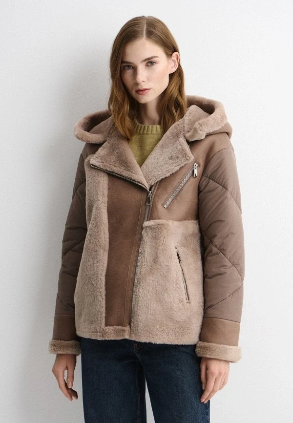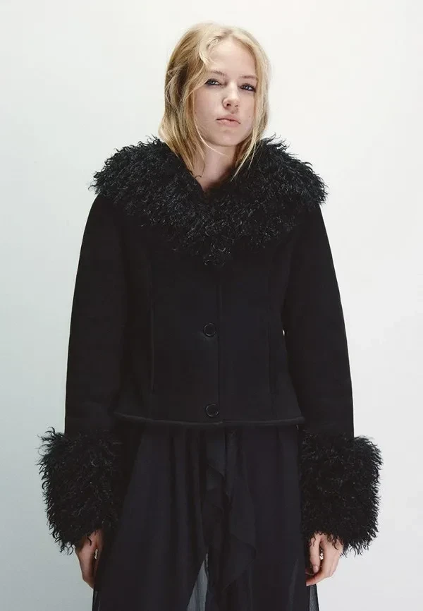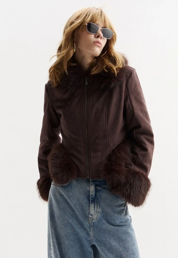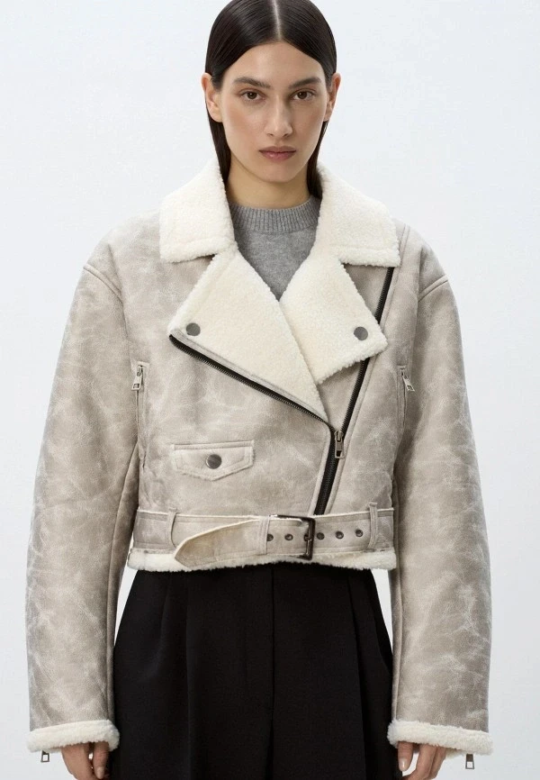 Если все предыдущие варианты — про эстетику и архитектуру одежды, то этот пункт — про игру с фактурами. В 2026 дизайнеры решили окончательно доказать, что эксперимент — не хаос, а инструмент. на пути к безупречному стилю. Поэтому в магазинах и на маркетплейсах в большом разнообразии появились дубленки с меховой отделкой по низу, крупными надписями, глянцевым металликом и нестандартной текстурой в целом.
