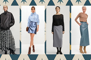 Юбка самой базовой модели становится акцентом образа, как только ты добавляешь ей фактуры. Кожа, особенно лаковая, сделает образ более драматичным и дерзким. Особенно если добавить к ней другие, контрастные текстуры. Например, кружевными колготками и полупрозрачной струящейся блузой. А для самых смелых — жакет из такого же материала выведет драму на максимум и создаст запоминающийся тотал-лук.