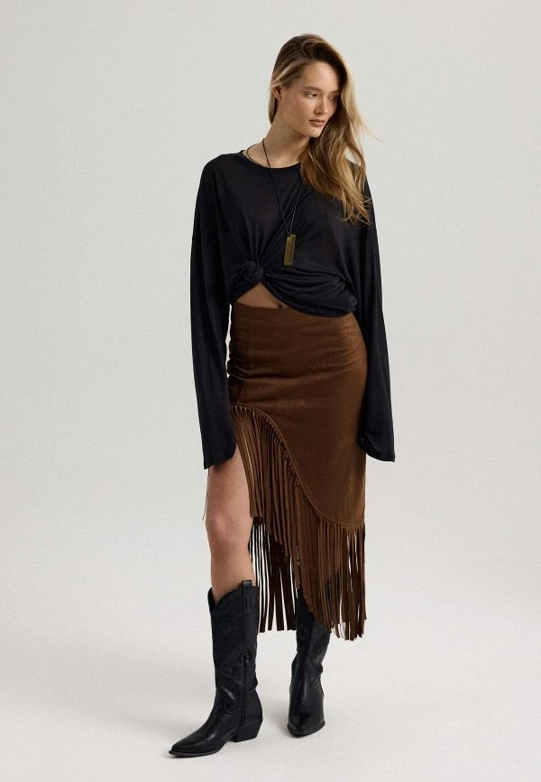 - Тренд на бохо и этнику возвращает в модные юбки 2026 варианты с крупными рюшами, натуральные ткани, свободный силуэт и этнические принты. Это про комфорт и свободу движения, про естественность и связь с природой.