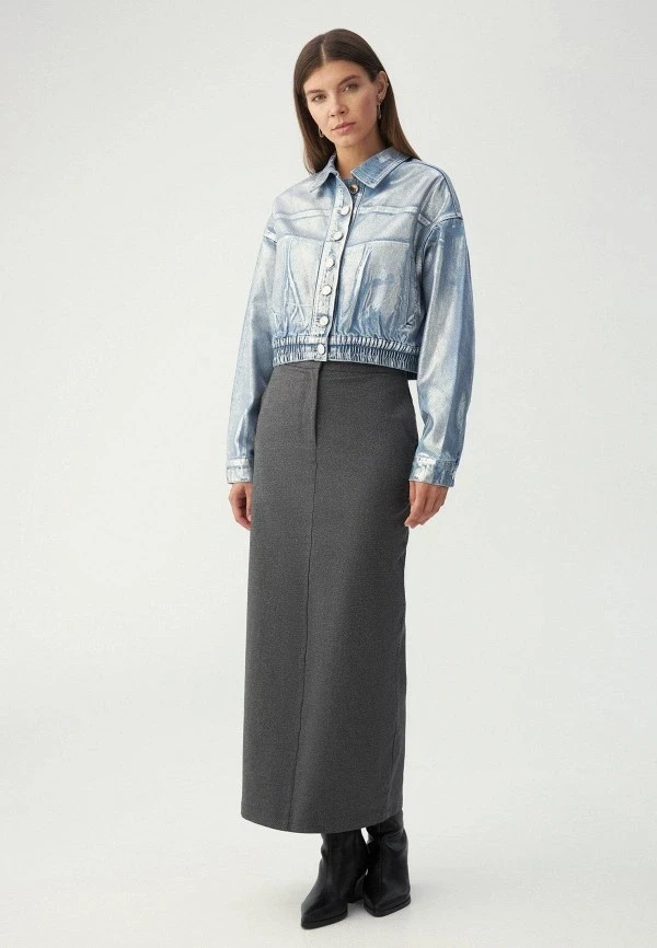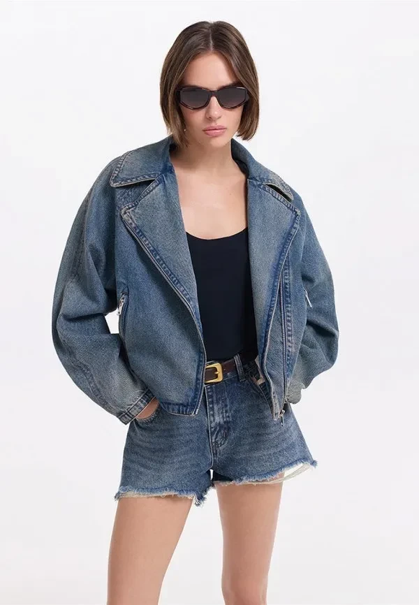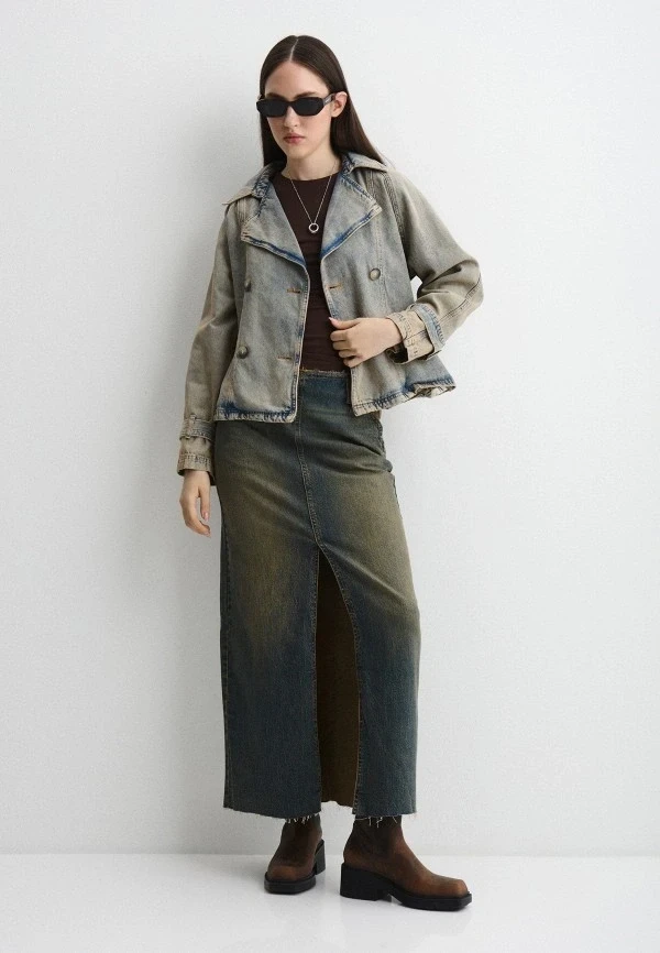 Крой тоже эволюционировал. Укороченные модели длиной до линии груди — для тех, кто хочет визуально вытянуть силуэт. Удлиненные джинсовки почти до колена — для любительниц драматичных образов. Асимметричные застежки, рукава-фонарики, декоративная вышивка, нашивки, потертости в неожиданных местах: дизайнеры будто соревнуются, кто сделает деним более непредсказуемым.
