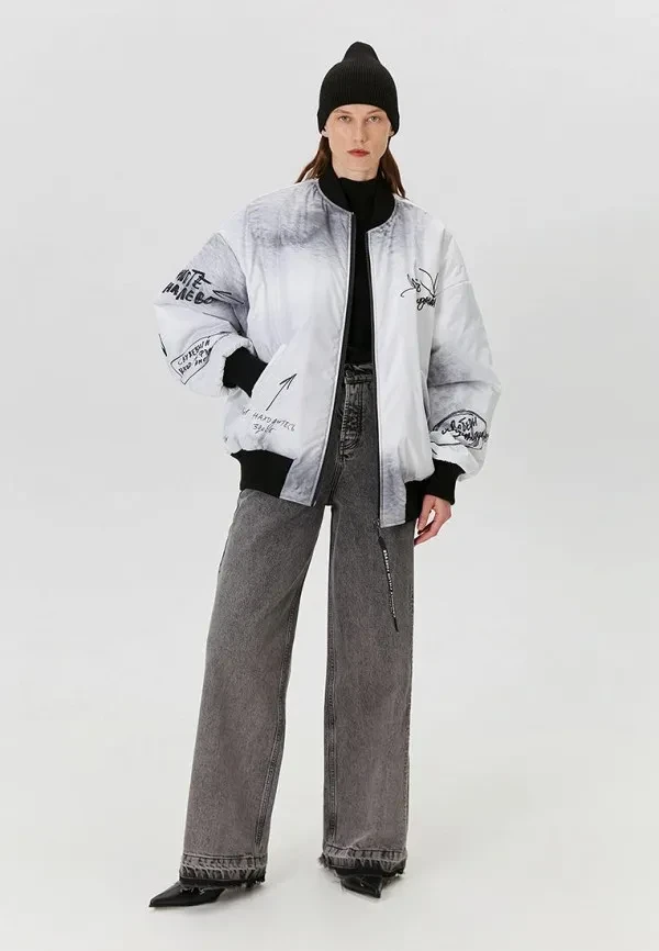 Фишка сезона — комбинировать легкий бомбер с теплыми многослойными образами. Например, надеть тонкий атласный бомбер поверх толстого вязаного свитера и дополнить все это великолепие шерстяными брюками. Или выбрать теплую версию и носить ее как самостоятельную верхнюю одежду с джинсами и ботильонами.