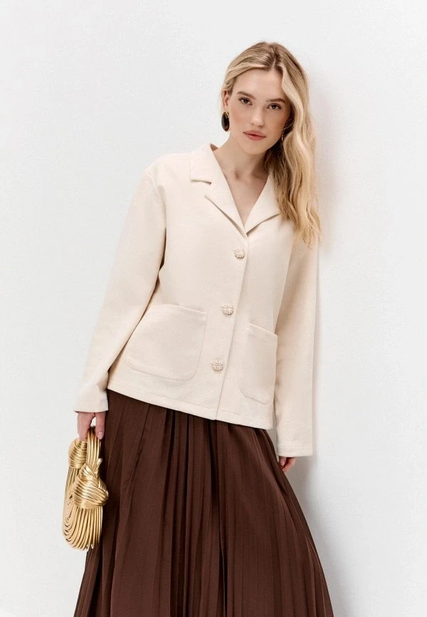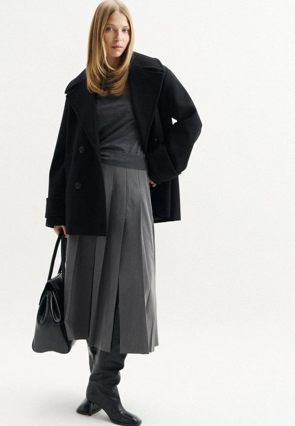 Фишка в пропорциях: длинная юбка уравновешивается коротким верхом. Если пальто или жакет будет длинным, образ «поплывет» и ты будешь выглядеть массивно. Короткий верх визуально вытягивает фигуру и делает силуэт четким. Дизайн жакета может быть классическим (с острыми лацканами) или более современным — с объемными рукавами, асимметричным кроем, декоративными пуговицами.